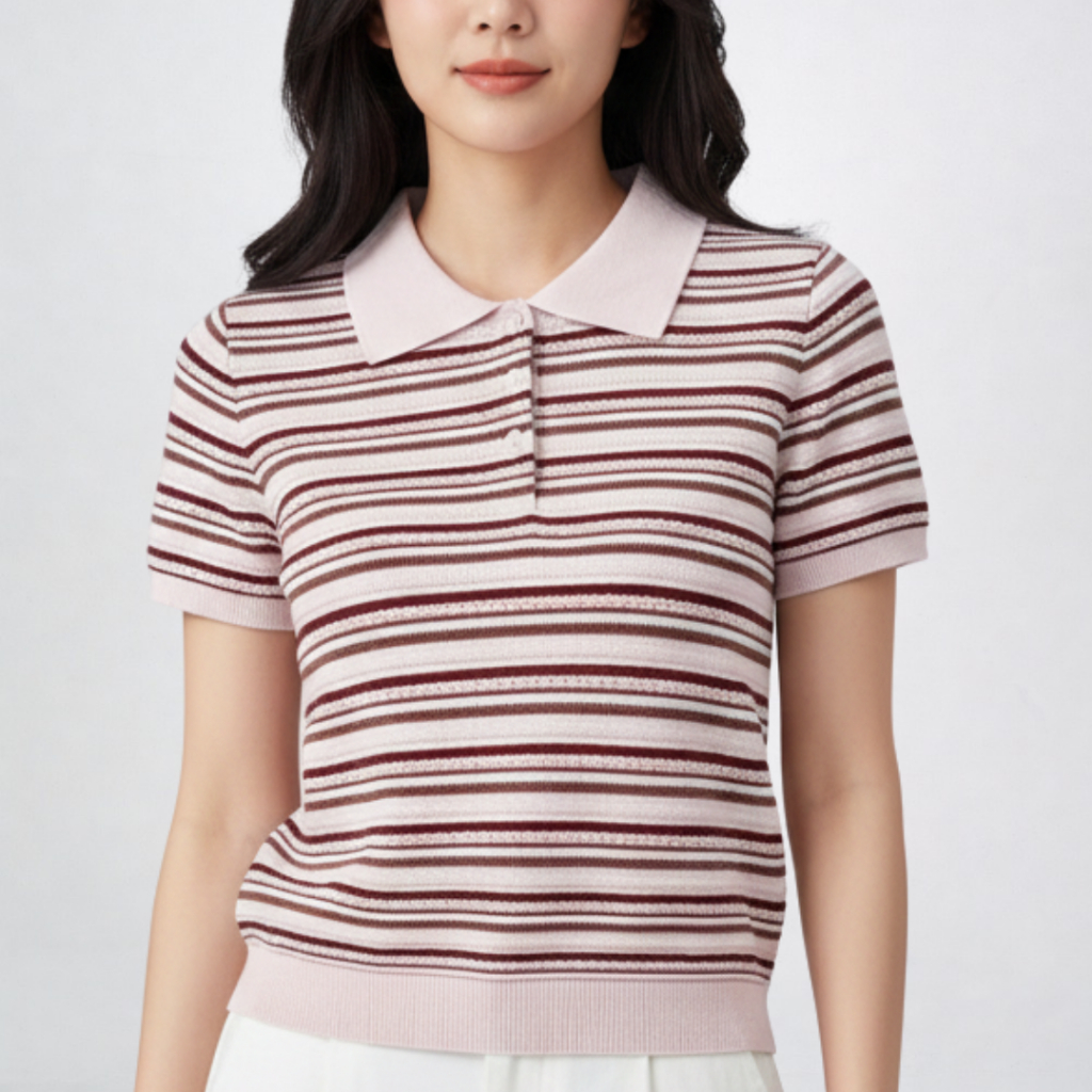 Glucoat | [U735/U790] เสื้อนิตติ้งไหมพรม คอปก สีชมพู ลายริ้ว/ลายทาง แต่งกระดุมหน้า ใช้งานได้จริง