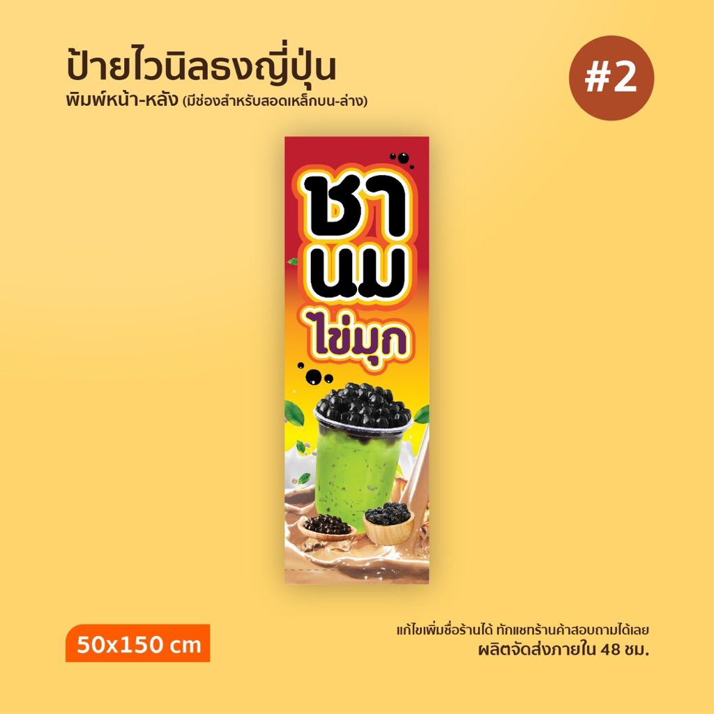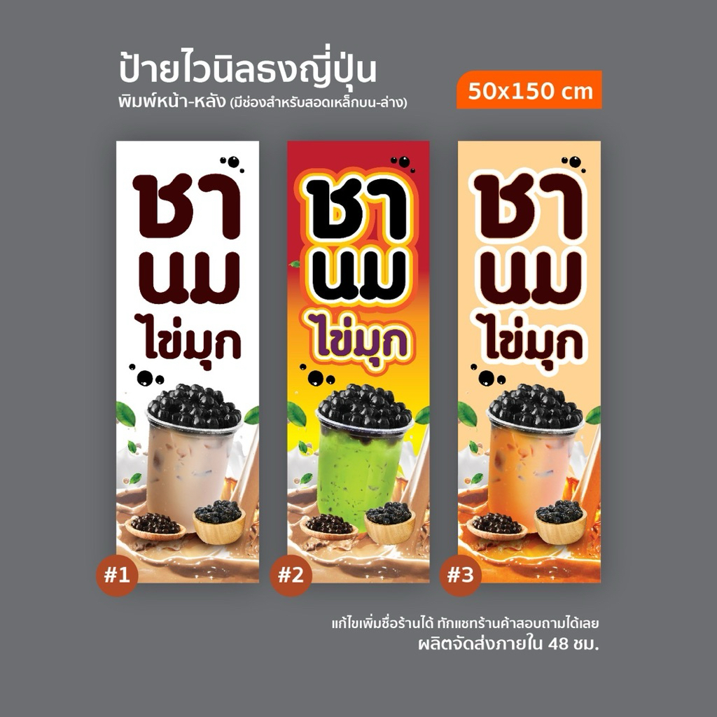 ป้ายไวนิลธงญี่ปุ่น ชานมไข่มุก พิมพ์หน้า-หลัง 50x150cm เพิ่มชื่อร้าน