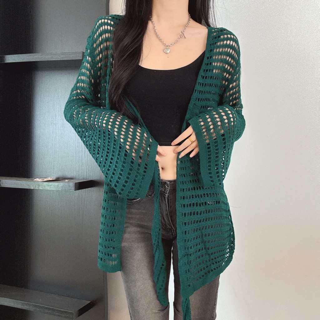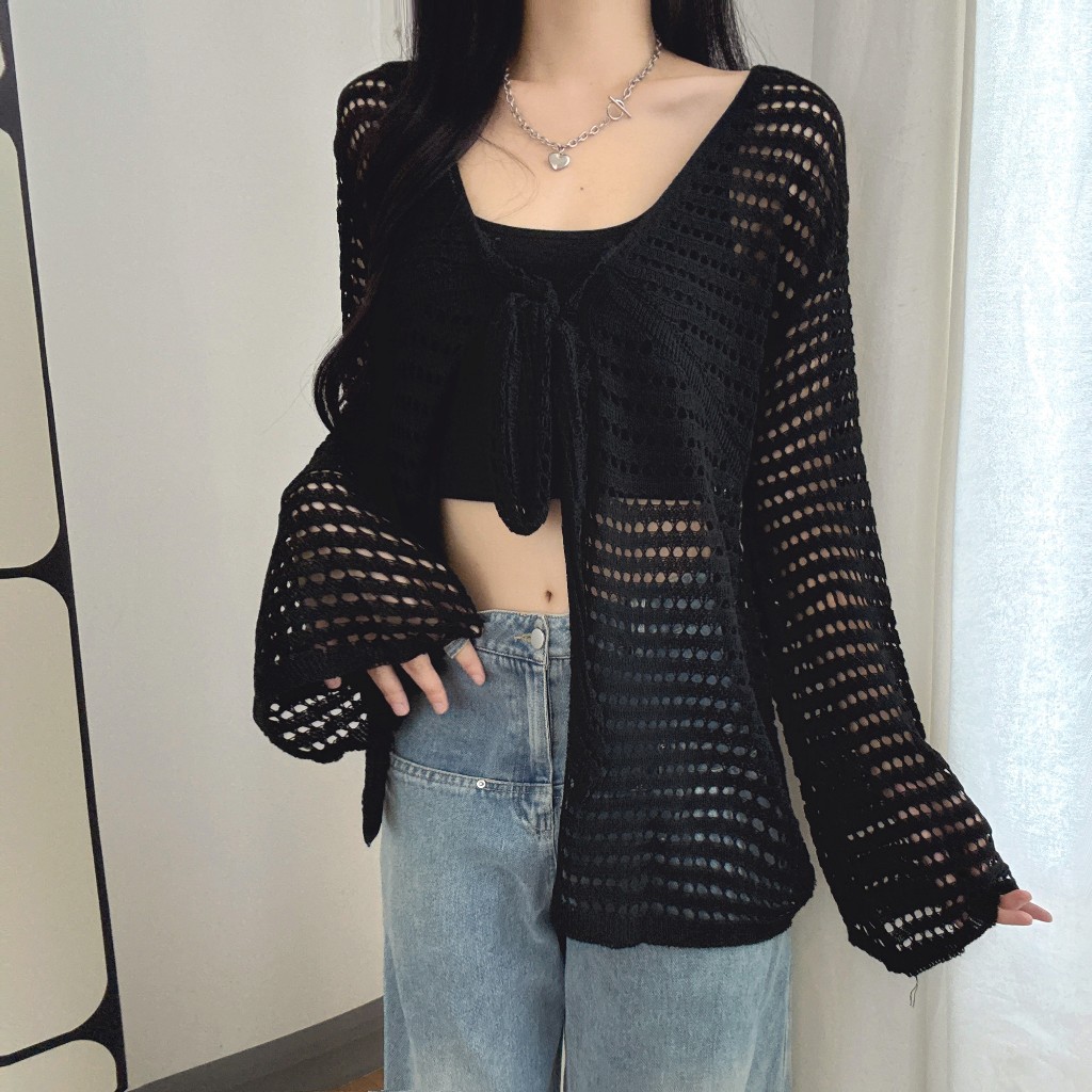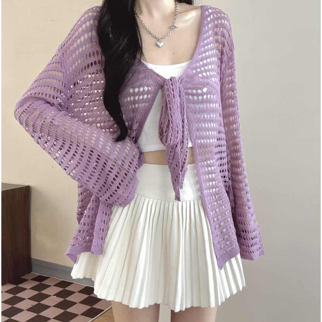 เสื้อแขนยาว เสื้อคลุมผ้าไหมพรมใส่คลุมกันแดด เสือตาข่าย แต่งเชือกผูกหน้า แฟชั่นผู้หญิง น้าน่ารักมาก