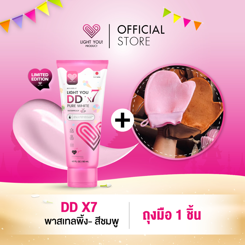 [ถุงมือ1ชิ้น+1หลอด] ครีมพอกผิว Light You DD X7 Pure White Cream มี 3สี บำรุงผิวกาย กันแดด กันน้ำ 80ml