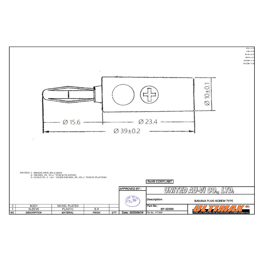 ULTIMAX BP-5255N ปลั๊กกล้วย ตัวผู้ แบบขันน๊อต คุณภาพสูง เสียบแน่น ผลิตไต้หวัน Banana Plug Male