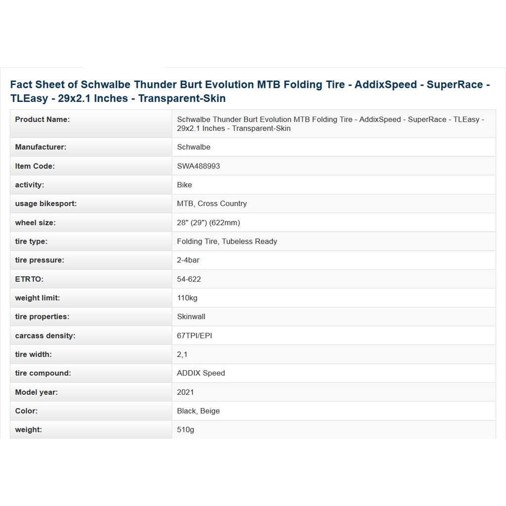 ยางนอก SCHWALBE Thunder Burt SUPER RACE สีเบจ 29นิ้ว ขอบพับ