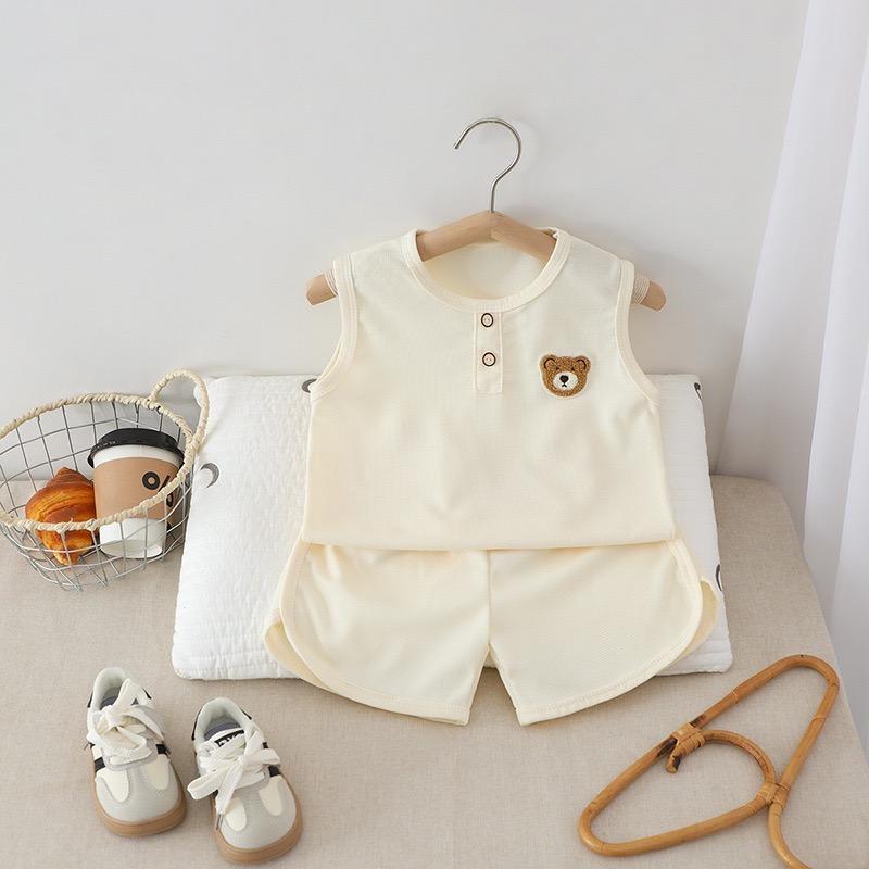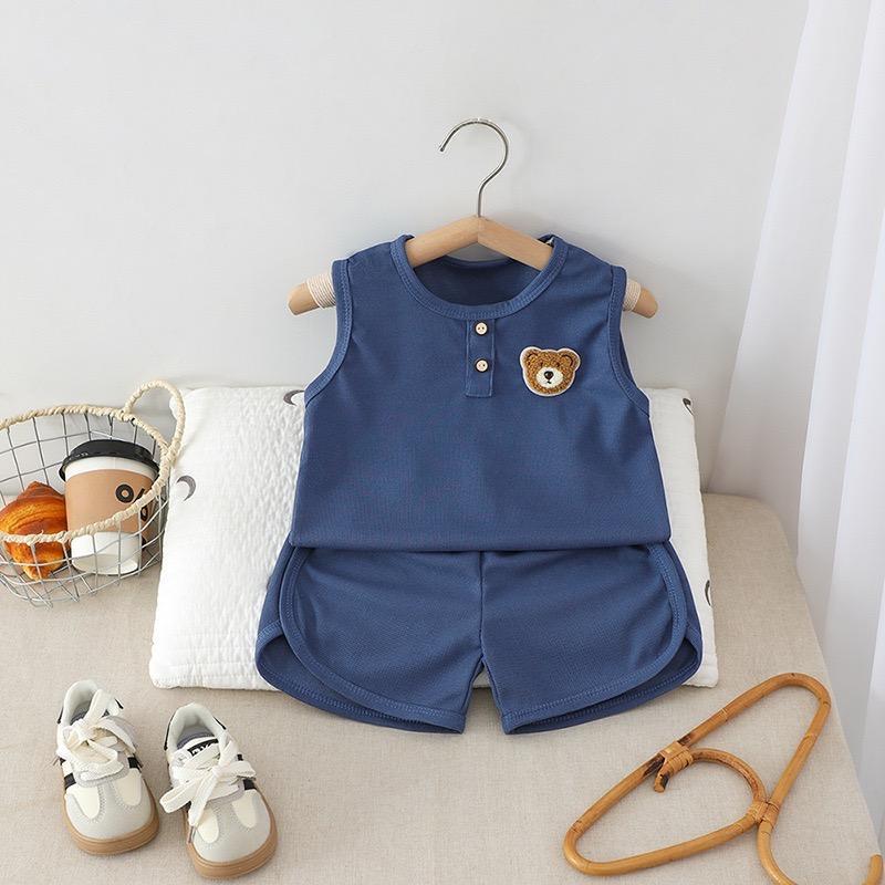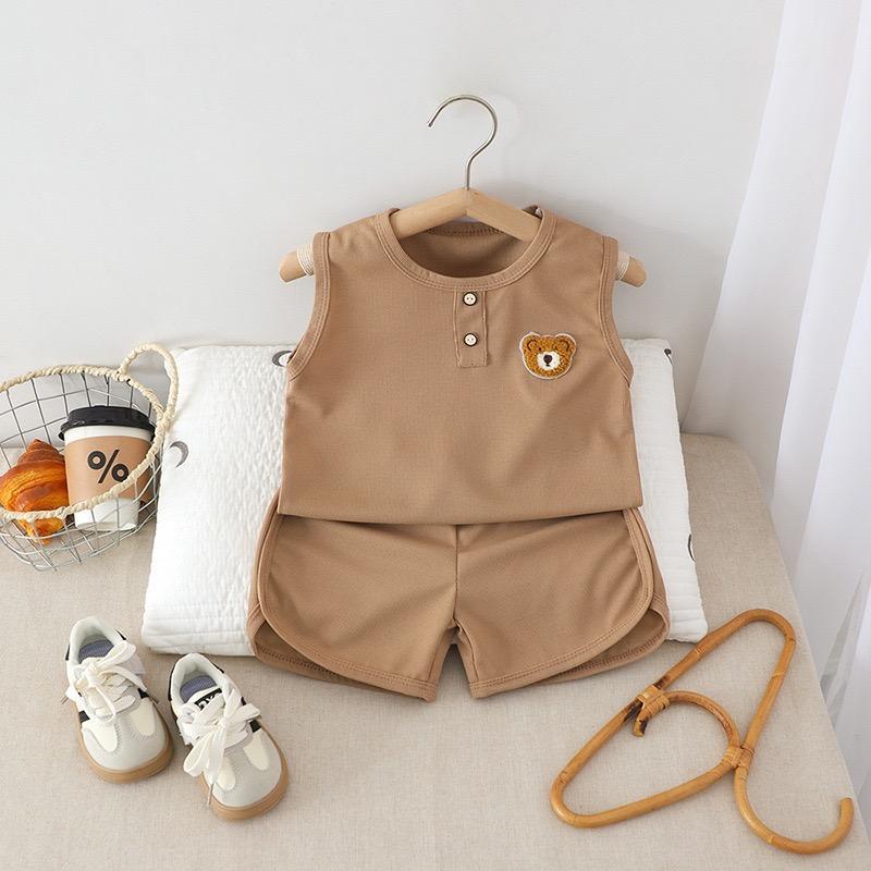 MooDeng Baby ชุดเซต เสื้อแขนกุด กางเกงขาสั้น ผ้าวาฟเฟิล ผ้าผสม คอกลม แขนสั้น เอวยางยืด ขาสั้น