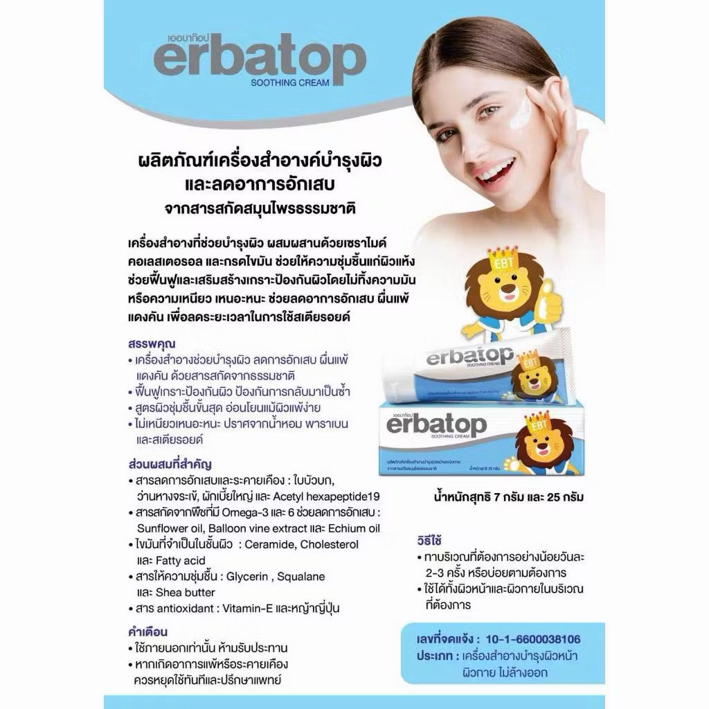 (แทน EZERRA) ERBATOP SOOTHING CREAM ทาผื่นแบบไม่มีสเตียรอยด์ เพิ่มความชุ่มชื้นให้กับผิวหนัง สำหรับผิวบอบบางผิวแพ้ง่าย