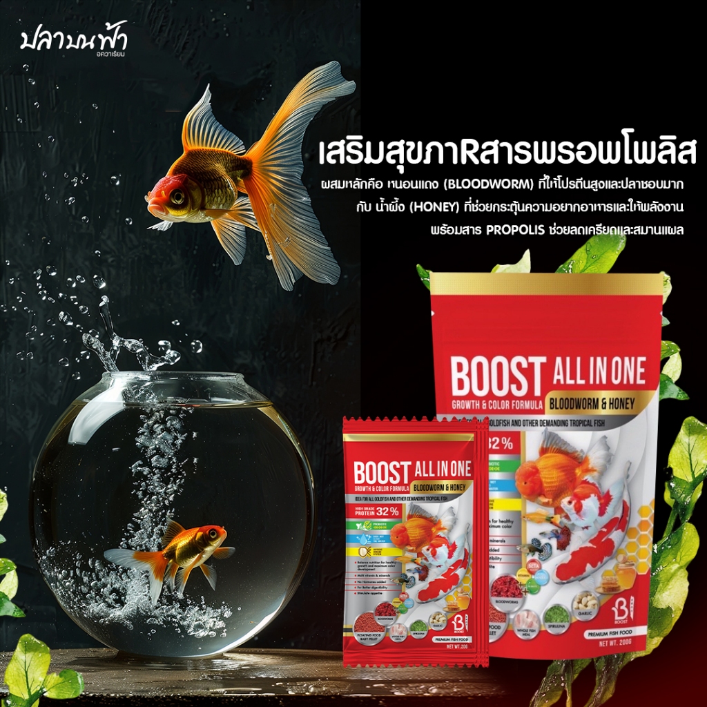 อาหารปลา BOOST All In One โปรตีนสูง เร่งสี เร่งโต ด้วยคุณค่าจากหนอนแดง และน้ำผึ้ง ทำให้ปลามีสีสันสวยงามตามธรรมชาติ