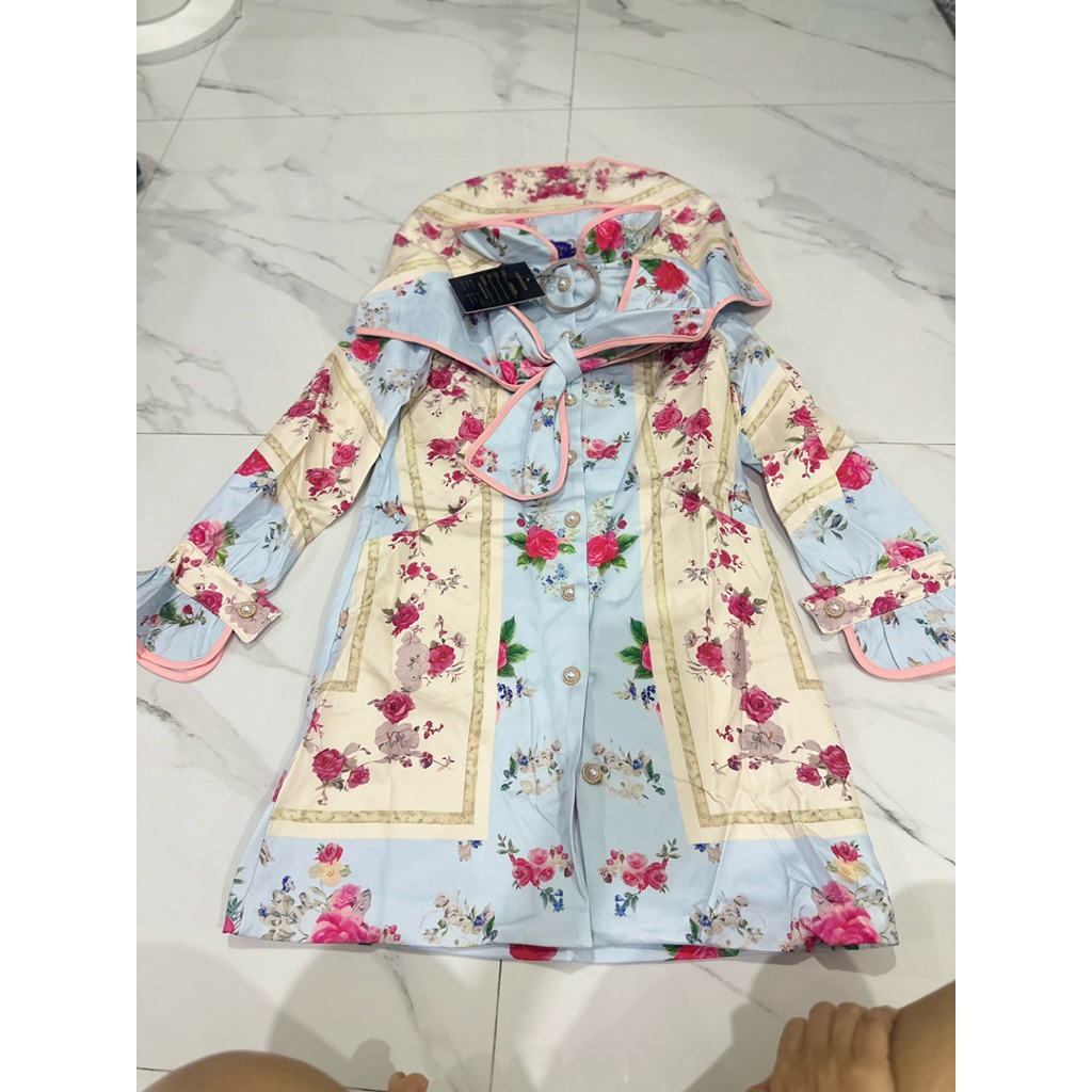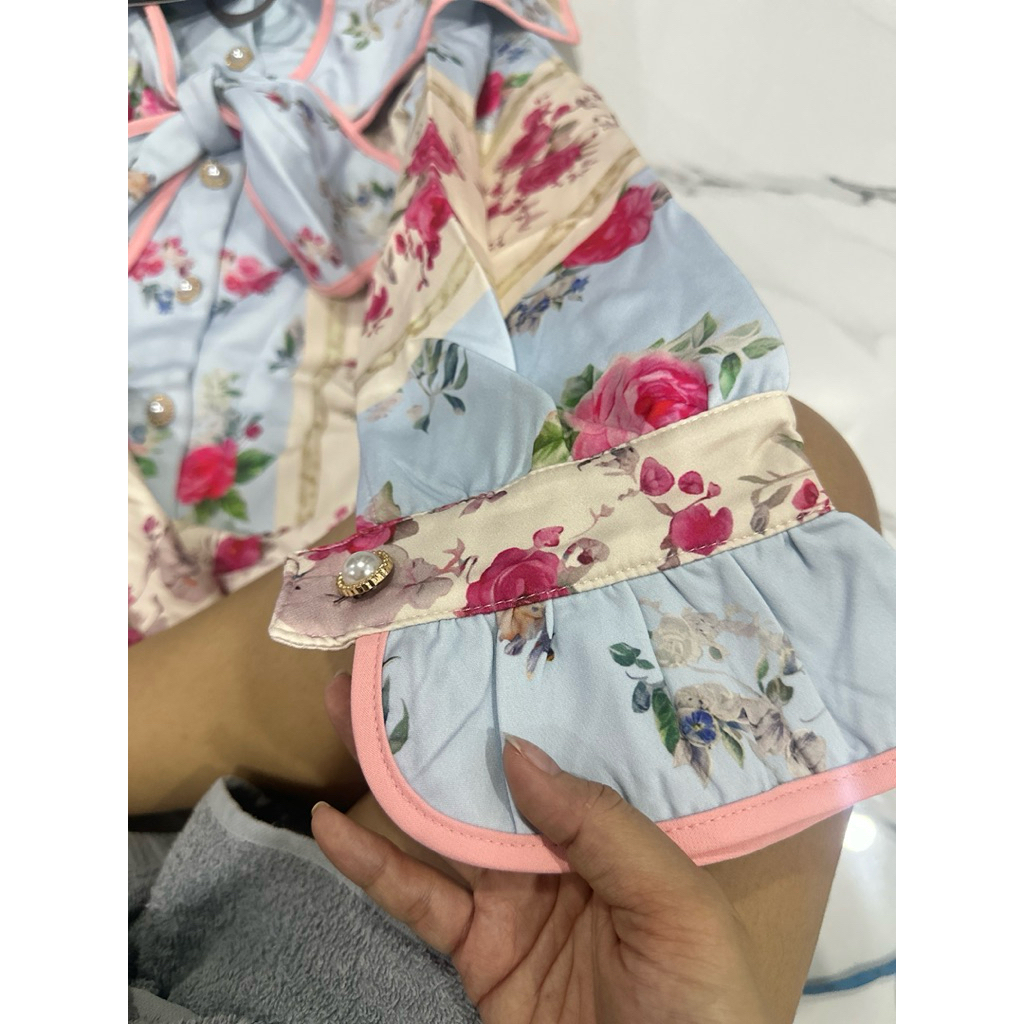 (อกใหญ่ 2 นิ้ว เอวปล่อย สะโพกปกติ ยาว33“) เดรสสั้น ผ้าสูท มีกระเป๋า ทรงปล่อย สีฟ้า ลายกุหลาบ งานป้าย chalita