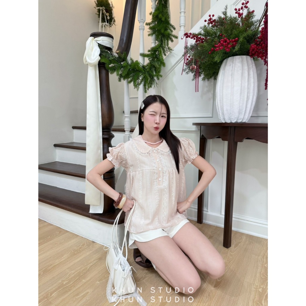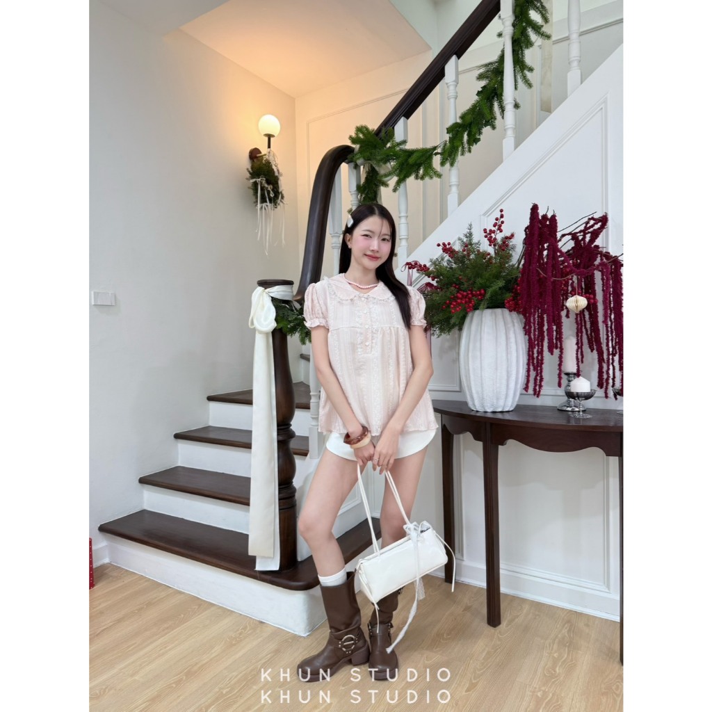 เสื้อคอบัวแขนตุ๊กตาแต่งกระดุมหัวใจ