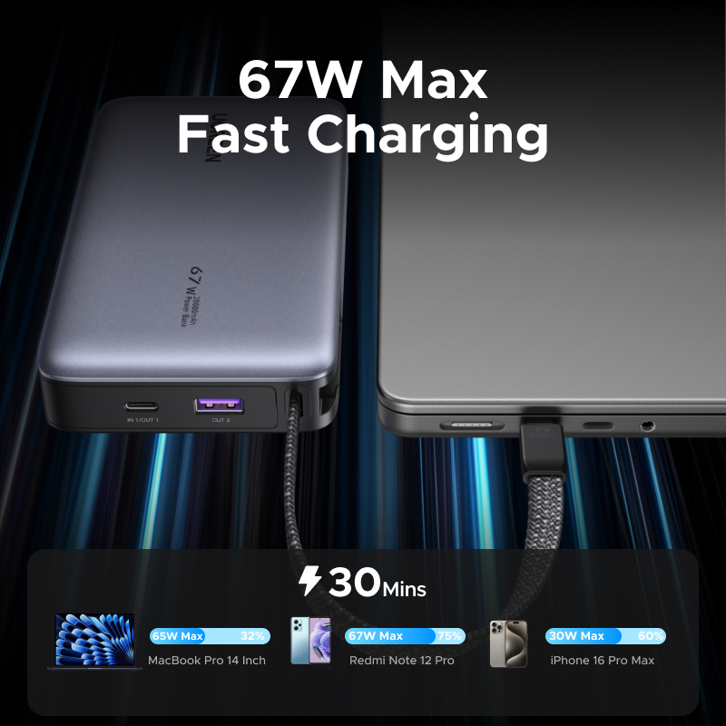 【CCC】UGREEN Nexode 67W/45W Max 20000mAh ในตัวสาย USB C 3 พอร์ต Fast Charging Power Bank Powerbank สําหรับ iPhone 17 Pro Max16 Pro Max Samsung S25 Ultra แล็ปท็อป
