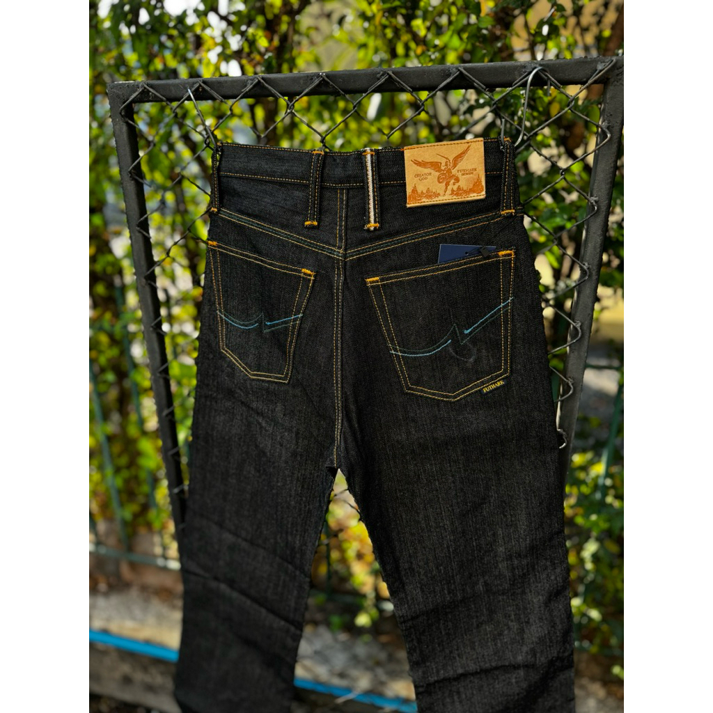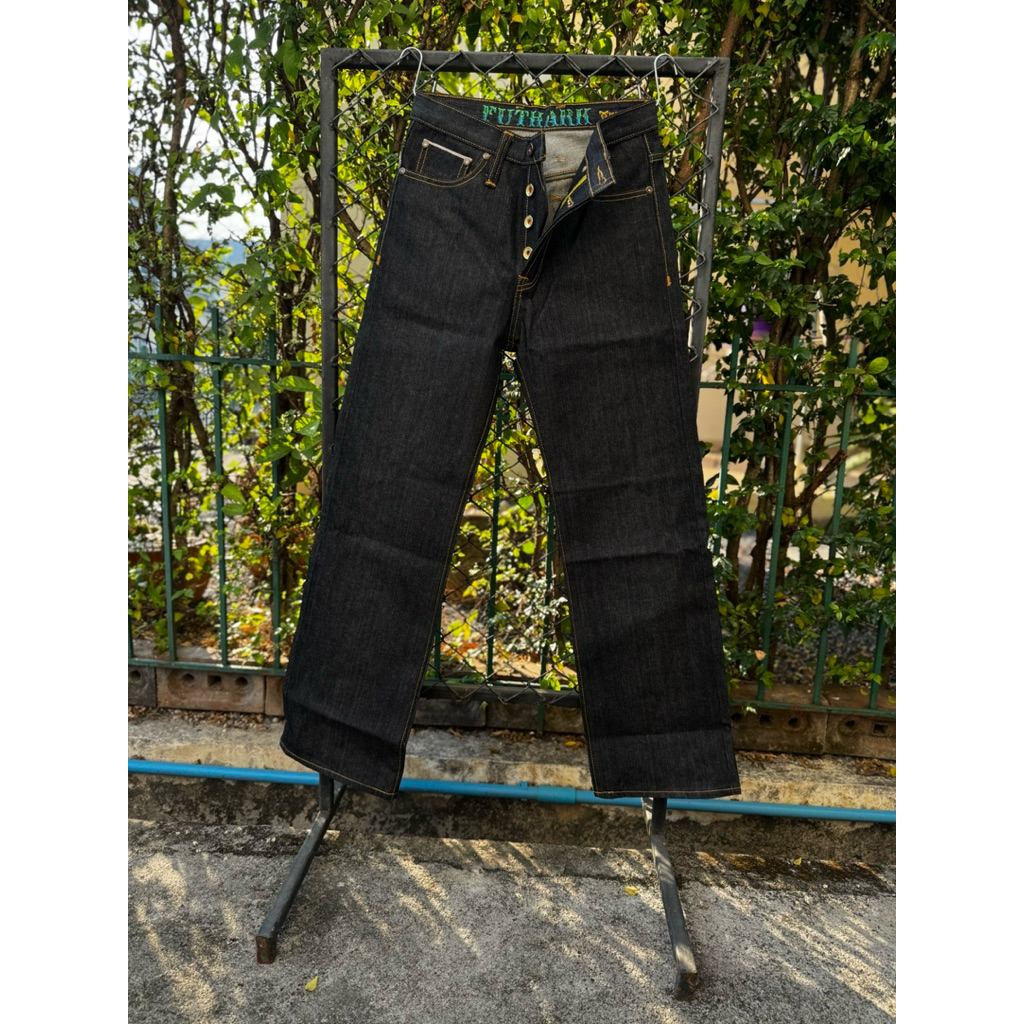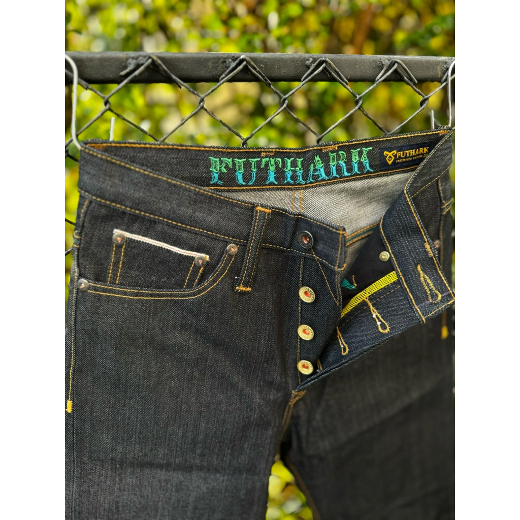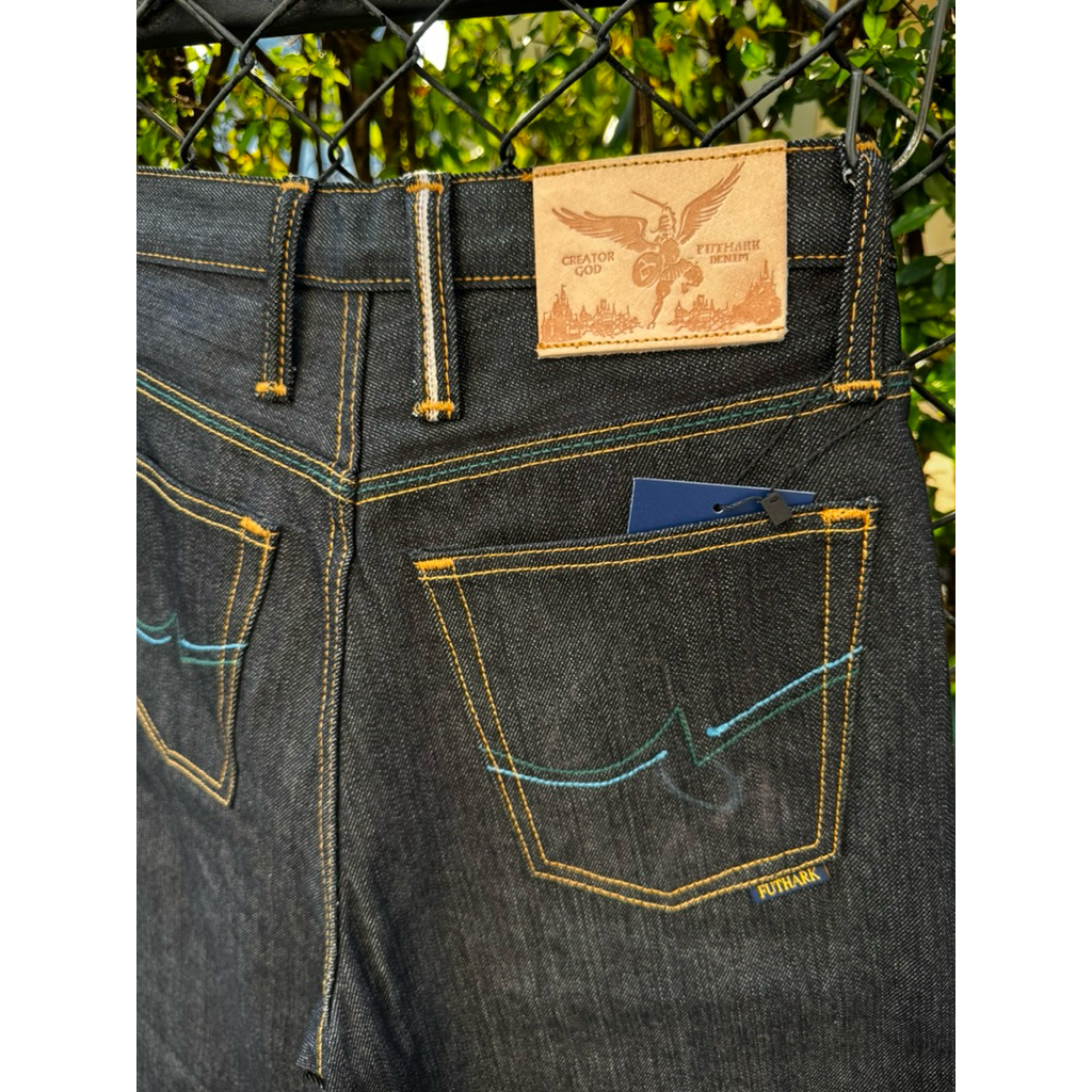FUTHARK CREATOR GOD รุ่นกระบอกใหญ่ปลายขา 9 นิ้ว ปักอาร์ตทูโทน ผ้าดิบริมแดง 16 ออนซ์