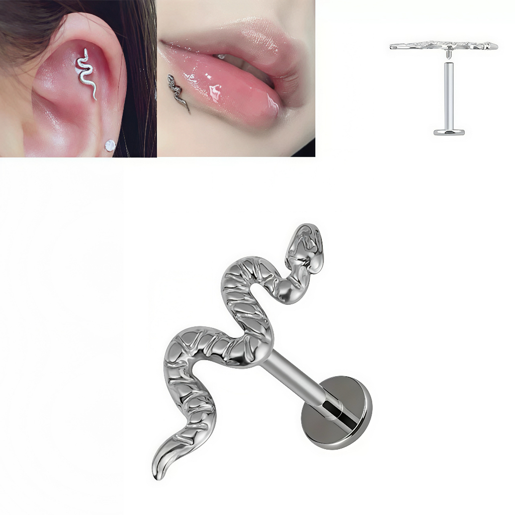 G23เกรดแพทย์ไทเทเนียมลายงูรูปงูต่างหูจิวหูกระดูกอ่อนสีเงินฐานแบนใส่นอนได้ไม่แพ้