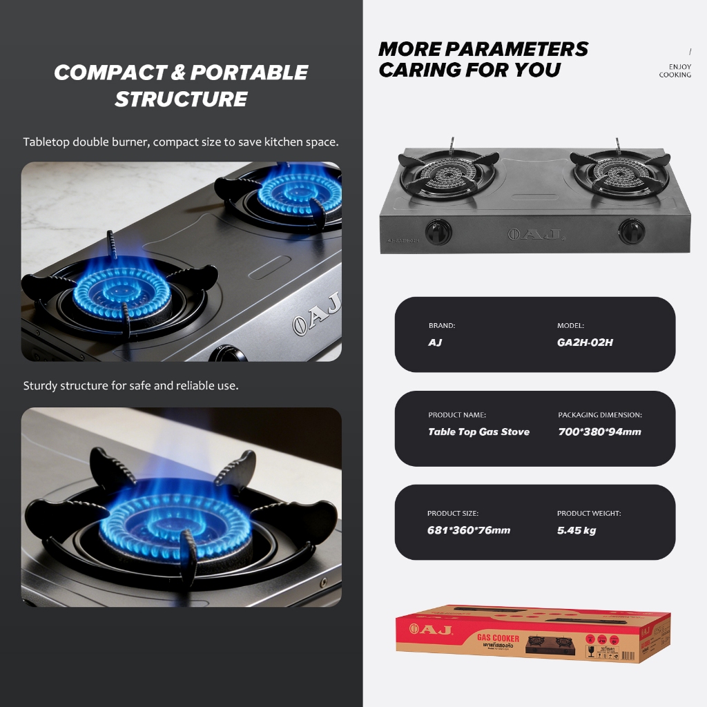 AJ เตาเเก๊สหัวคู่ รุ่น GA2H-02H เตาหัวฟู่ ความร้อนสูง ประหยัดเเก๊ส ผลิตจากเหล็กหล่อ เเข็งเเรง รับประกัน 2 ปี