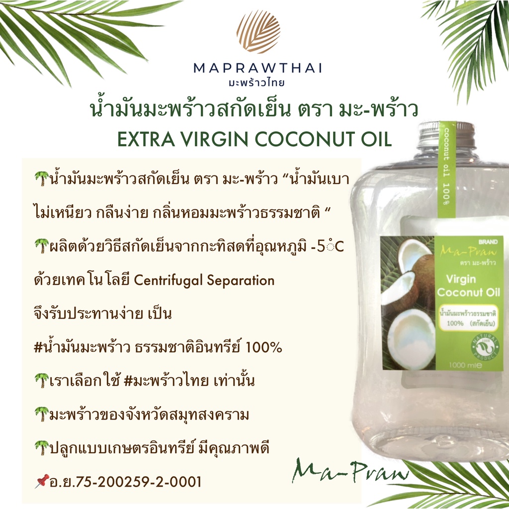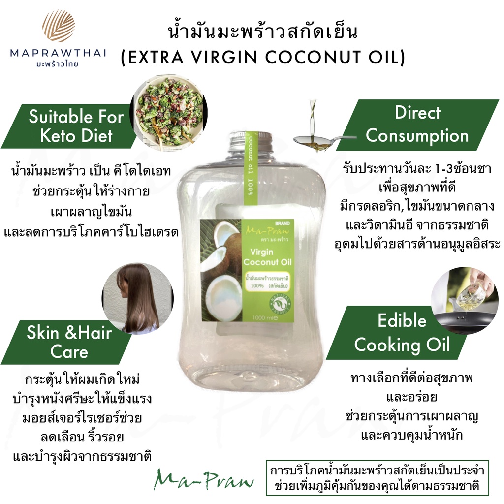 น้ำมันมะพร้าว 1,000ml น้ำมันมะพร้าวสกัดเย็น 100% Virgin Coconut Oil 1000ml ทาผิว หมักผม ทานได้ Ma-Praw
