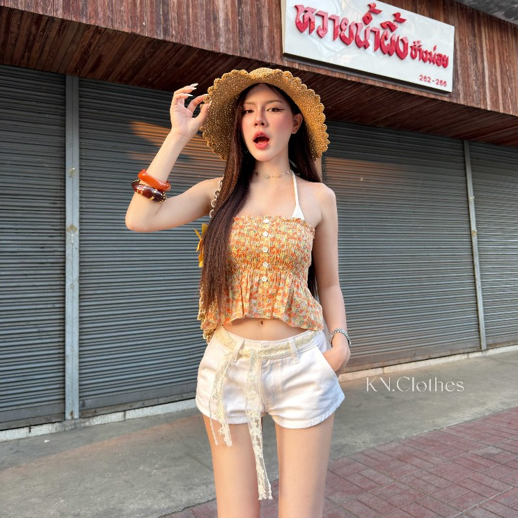 Blossom top : เสื้อเกาะอกสม็อค แต่งสายบิกินี กระดุมดอกไม้ เนื้อผ้าคอตตอน KN.Clothes