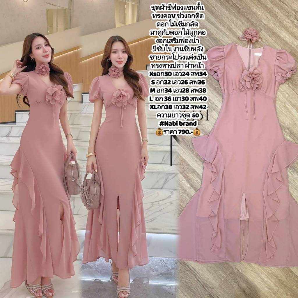 XS-XXL⭐ชุดเดรสยาว สีครีม ชมพู เขียว ทอง ใส่ออกงาน งานเลี้ยง ไปงานแต่ง งานบวช ชุดชีฟอง ชุดซาติน