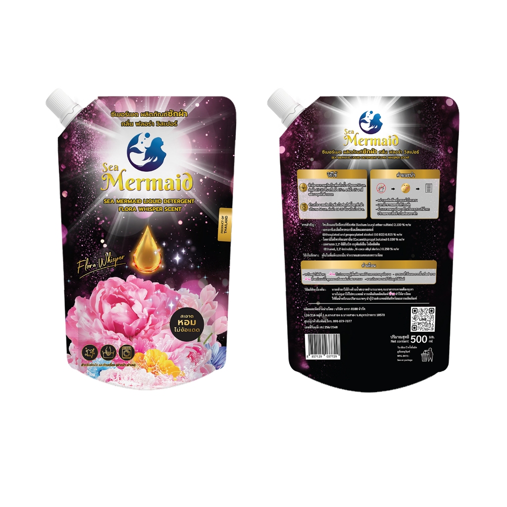 ใหม่! Sea Mermaid น้ำยาซักผ้าซีเมอร์เมด 500 มล.x 4ถุง กลิ่น Flora Whisper หอมพรีเมี่ยม ไม่ง้อแดด