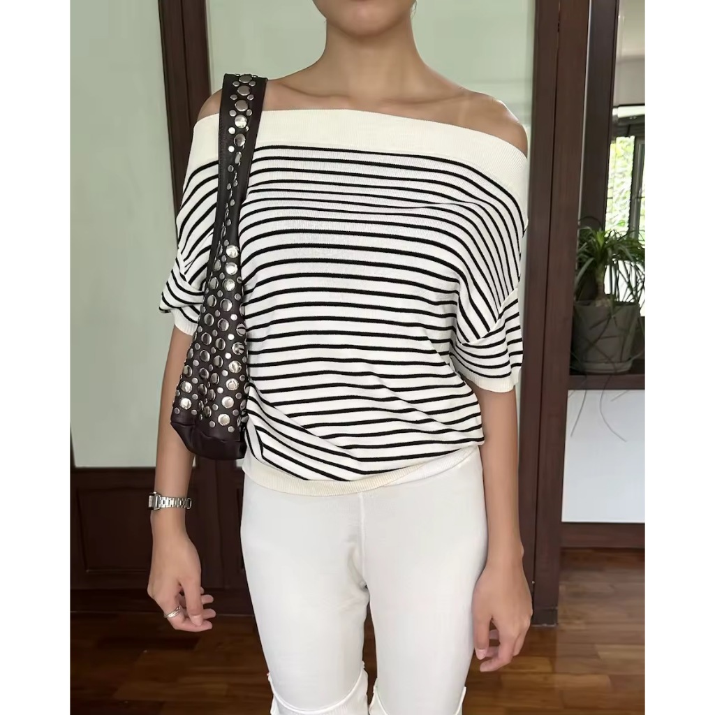 HerSonders | Marine Stripe Top (3 colors) - เสื้อไหมพรมเกาะไหล่/ปาดไหล่ ทอลายขวาง ทรง oversize ใส่ได้หลายแบบ