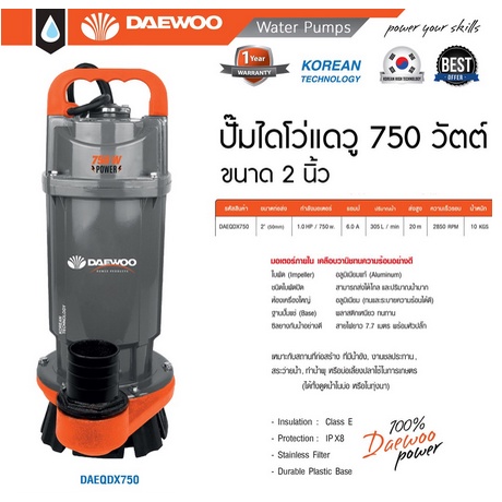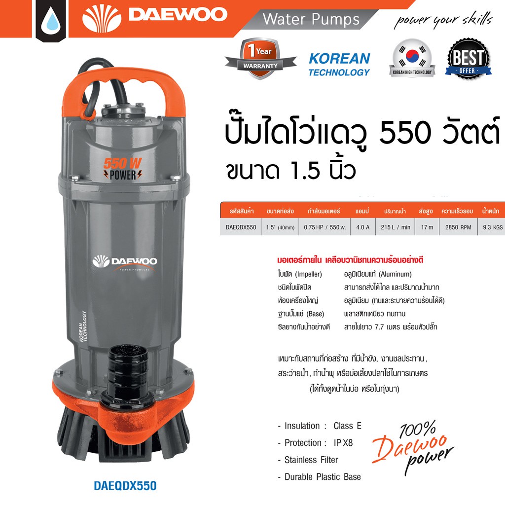 ปั๊มแช่ ปั๊มจุ่ม DAEWOO แดวู ท่อ 1.5, 2 นิ้ว DAE-QDX-550,750 แบรนด์เกาหลี มอเตอร์ทนความร้อนพิเศษ Korea Brand