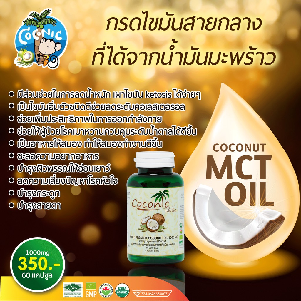 coconut oil น้ำมันมะพร้าวออร์เเกรนิค สกัดเย็น ชนิดแคปซูล เม็ดละ1000มิลลิกรัม กระปุกละ 60 เม็ด