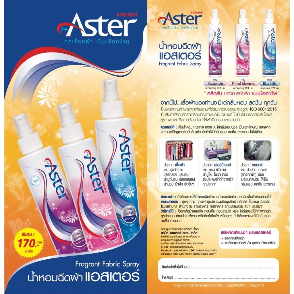 น้ำหอมฉีดผ้าแอสเตอร์ น้ำยาฉีดผ้าหอม เลือกสีได้