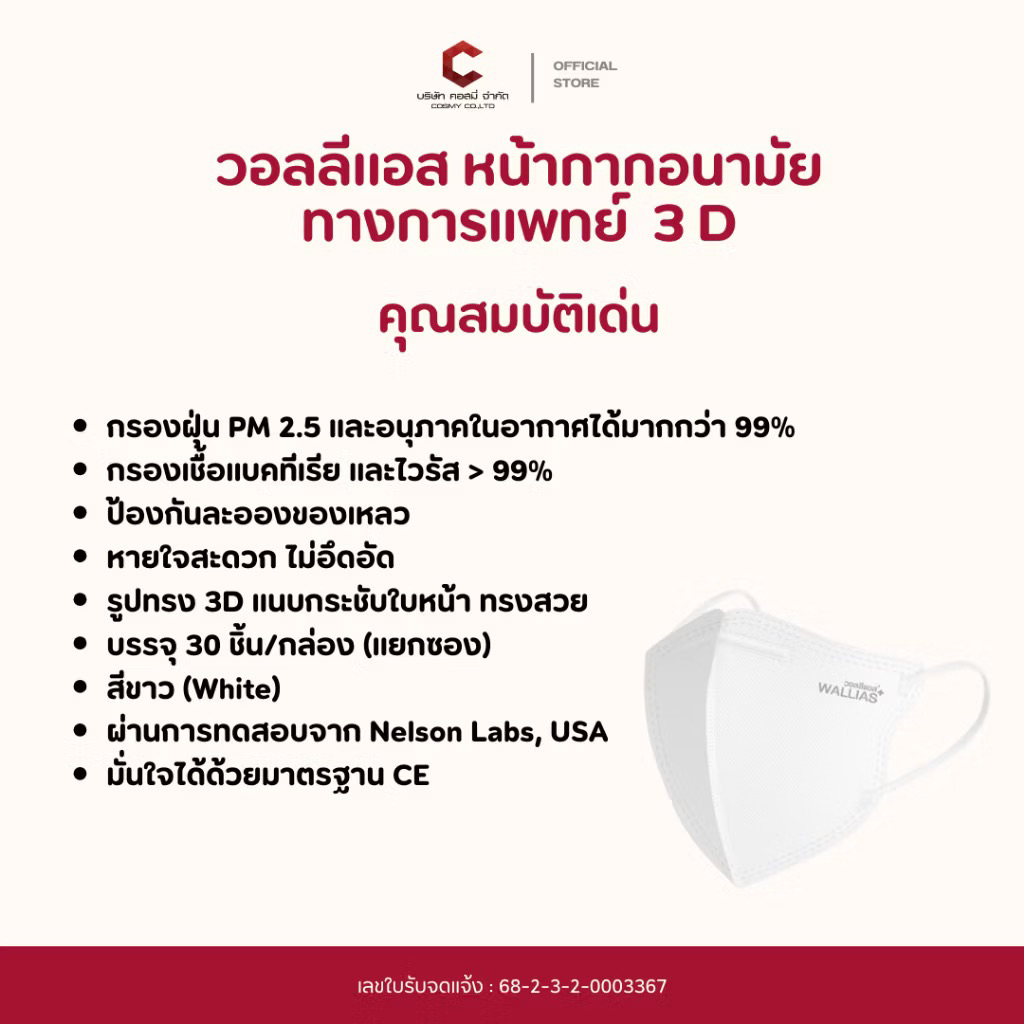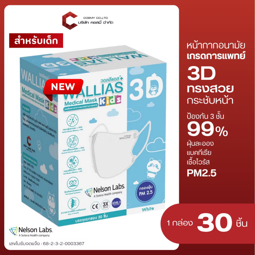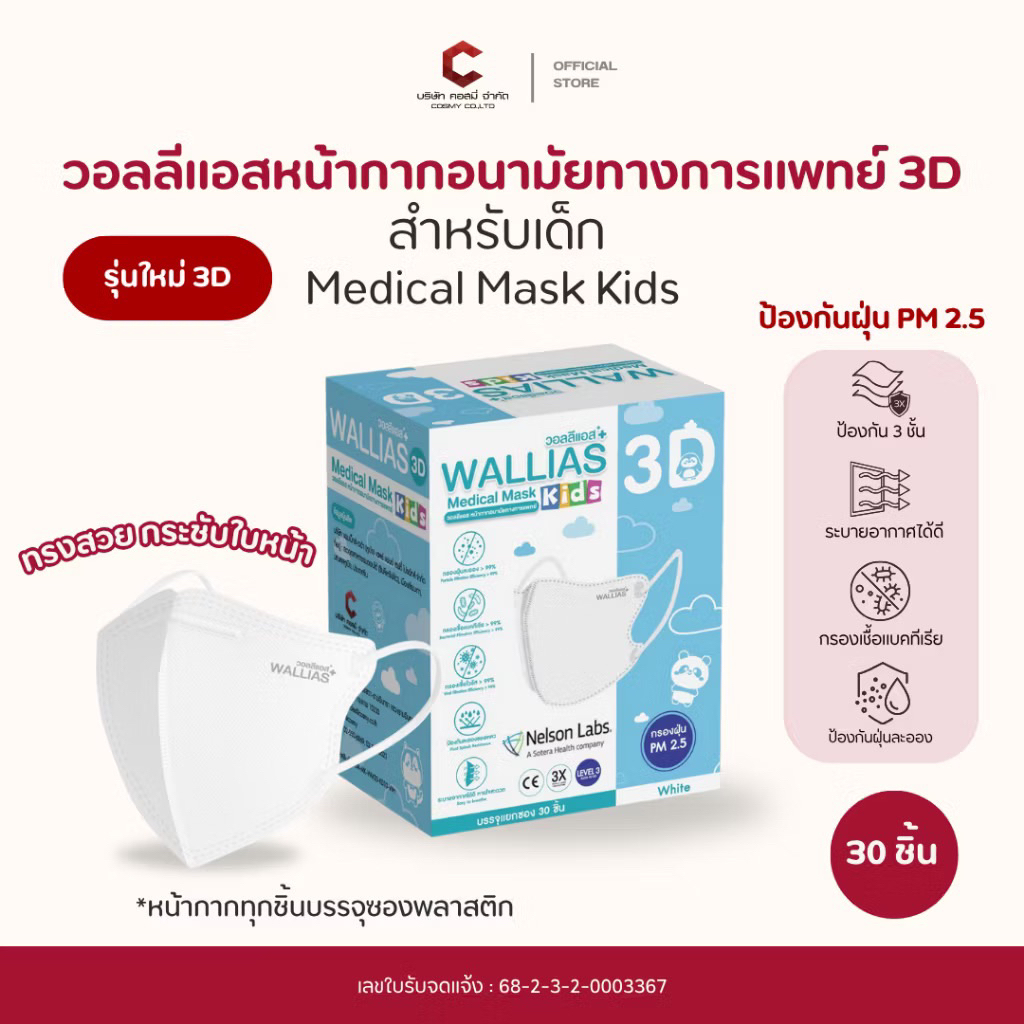[รุ่นใหม่] WALLIAS 3D หน้ากากอนามัยทางการแพทย์ (สำหรับเด็ก) Medical Mask 3D KIDS ป้องกันฝุ่น PM2.5 ได้รับมาตรฐาน