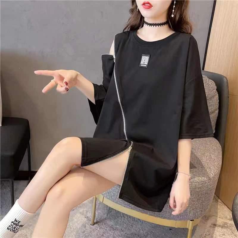 เสื้อแขนสั้น Oversize (อก 48-64 นิ้ว) คอกลม ซิปหน้ารูดขึ้น-ลง เปิดไหล่ได้ ผ้าคอตตอล พร้อมส่ง A18
