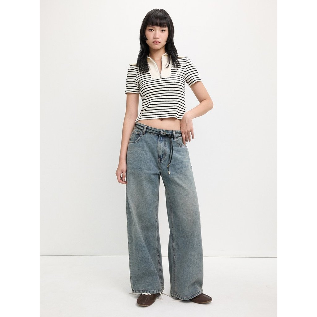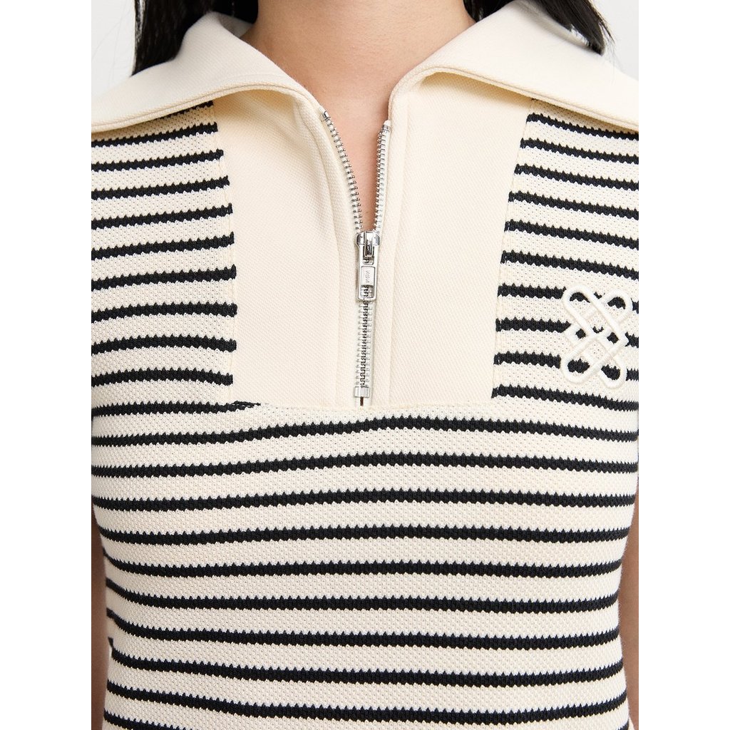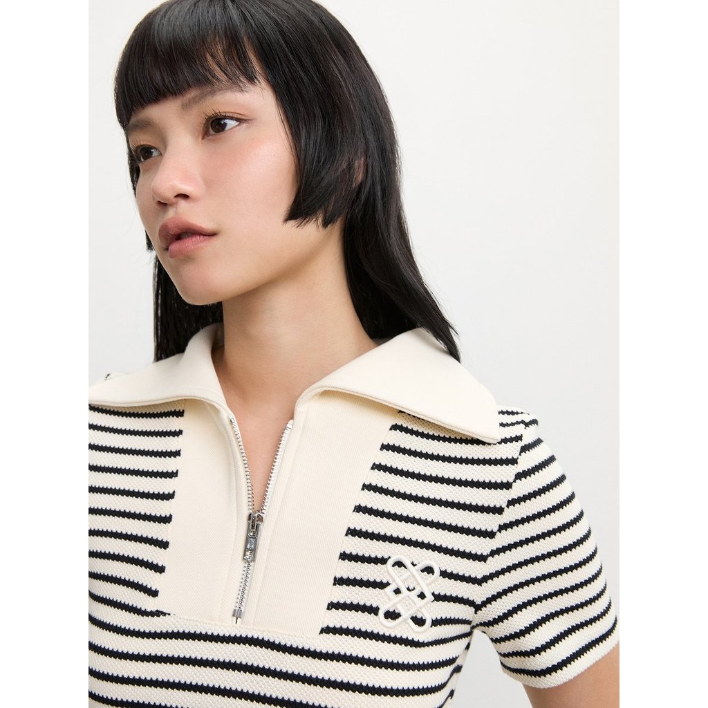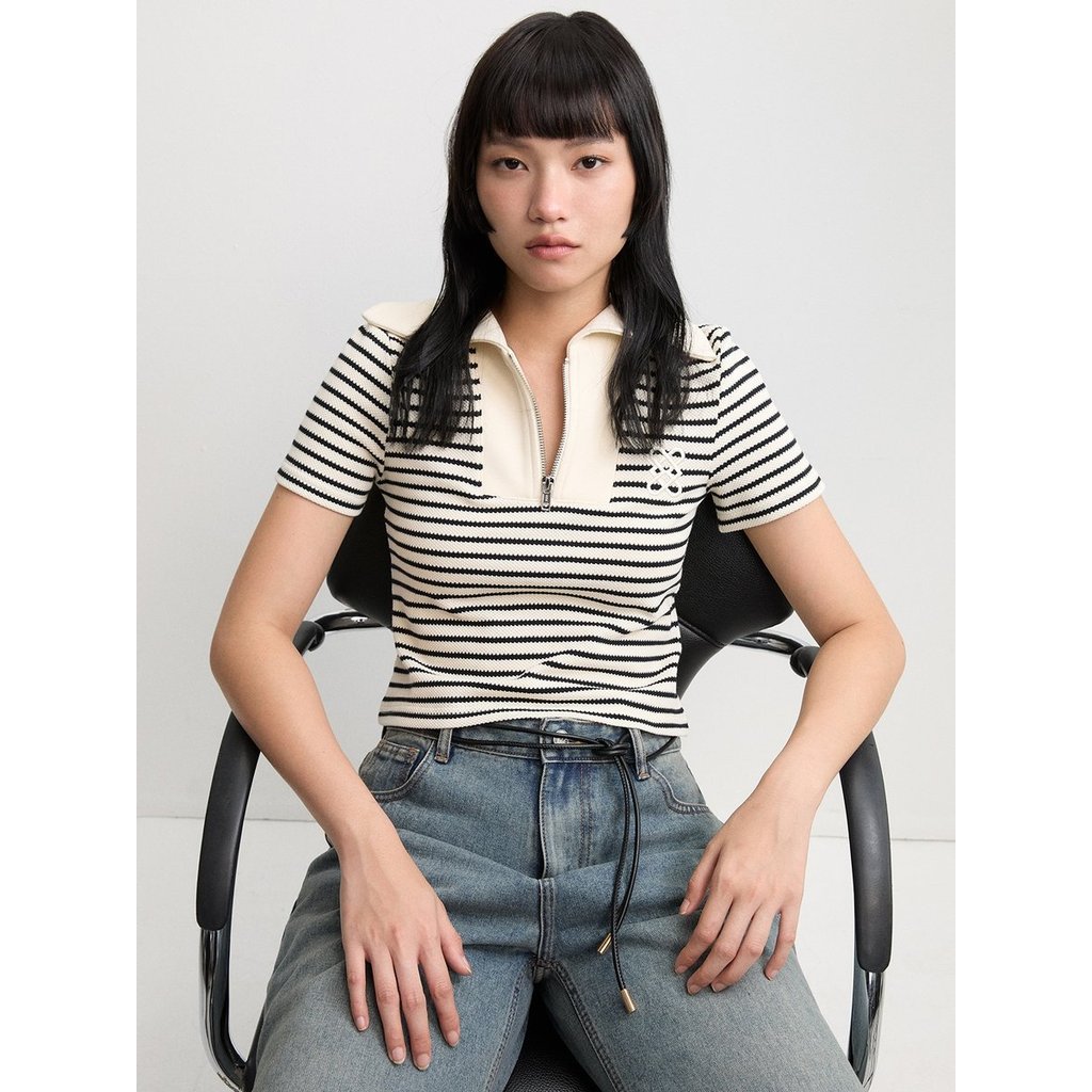 [Pomelo] เสื้อโปโลแขนสั้น ลายขวา ซิปหน้าครึ่งตัว ปกเสื้อขนาดใหญ่