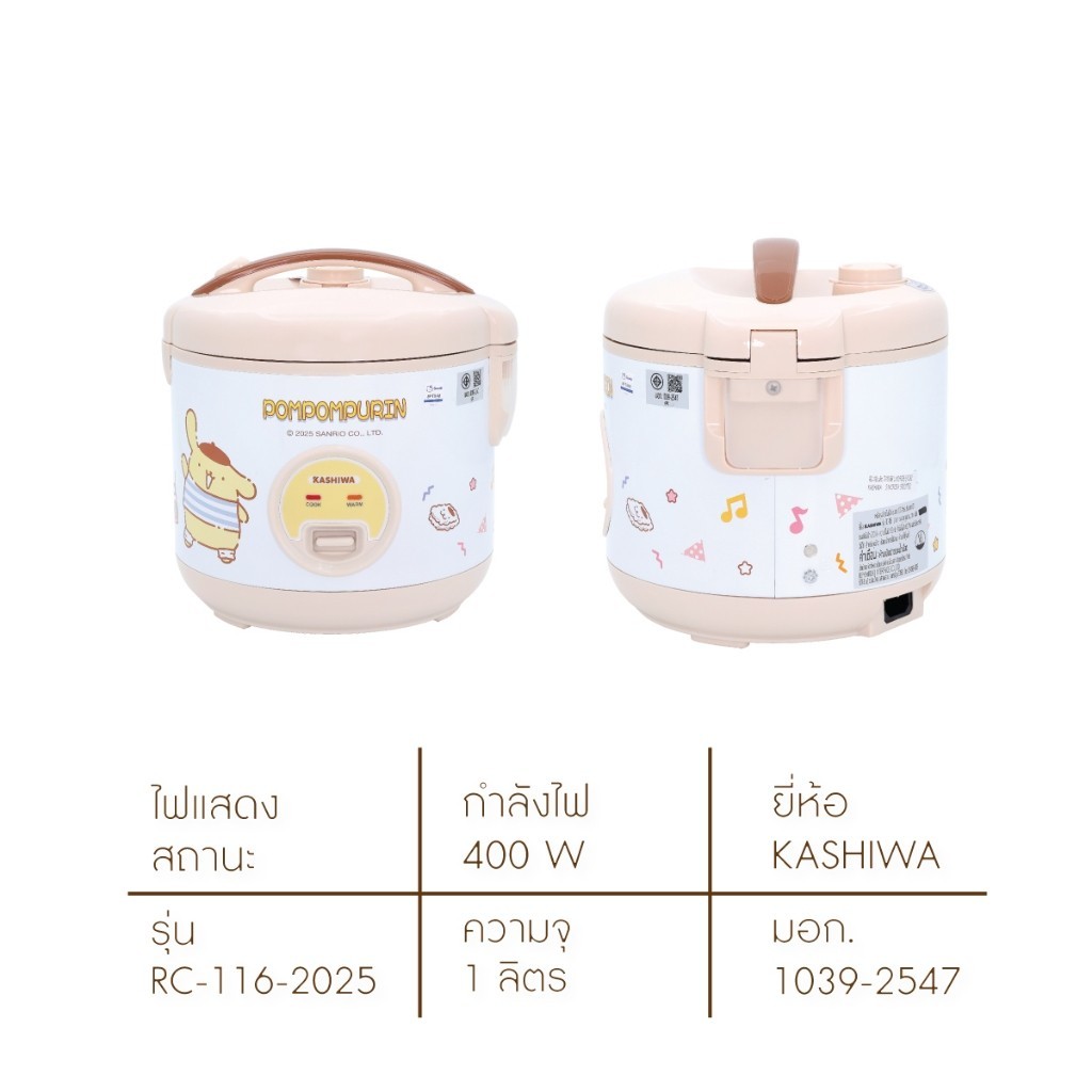 Sanrio หม้อหุงข้าวไฟฟ้า รุ่น RC-116 ลาย POMPOMPURIN รุ่น 2025 ขนาด 1 ลิตร กำลังไฟ 400 วัตต์