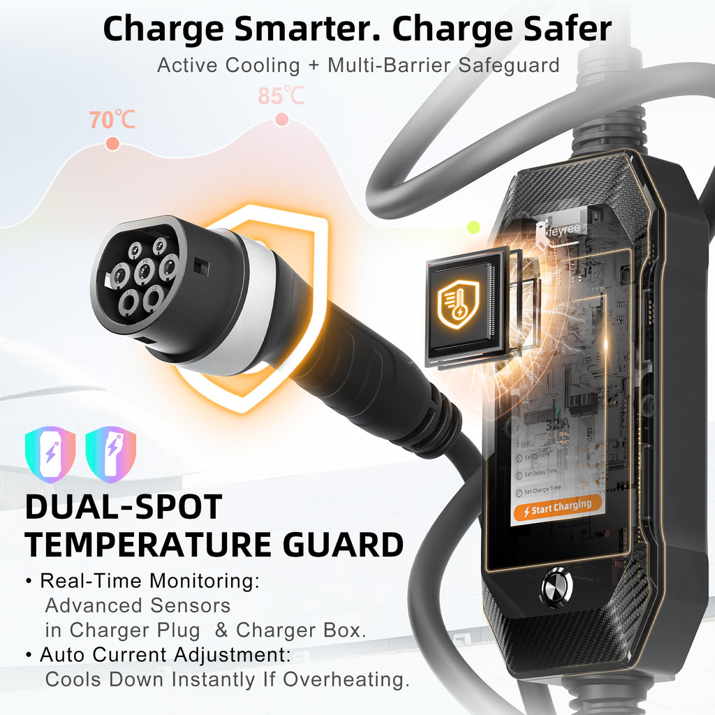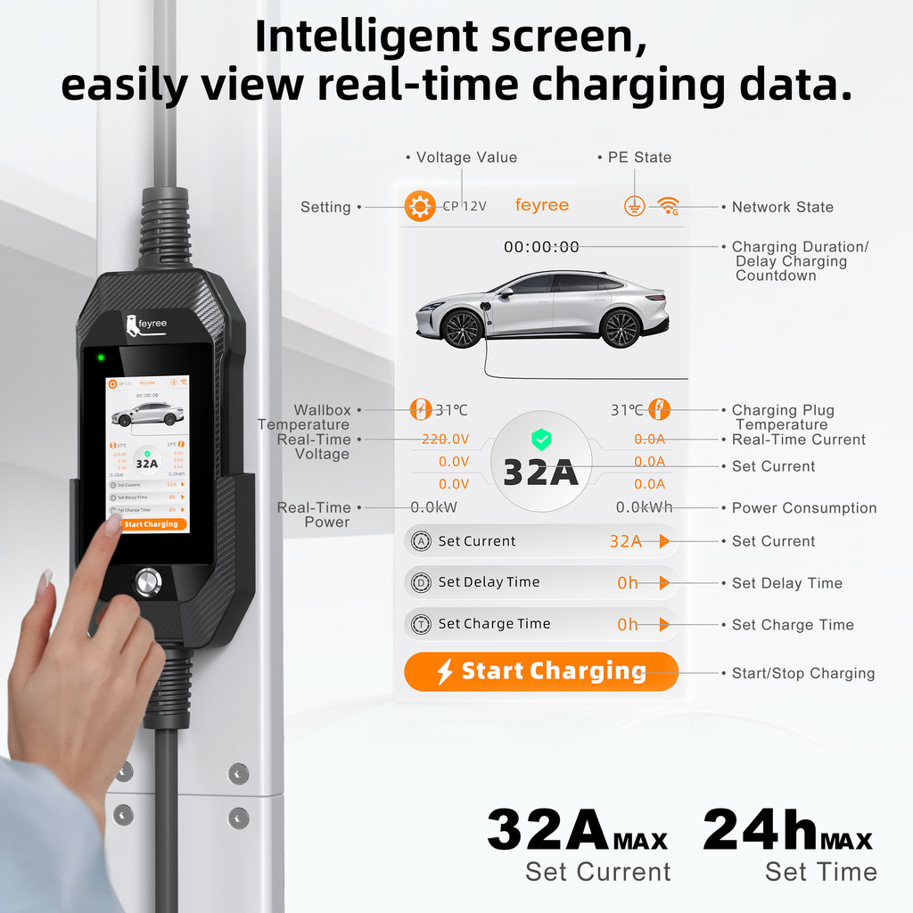 Feyree หน้าจอสัมผัสขนาด 4.3 นิ้วแบบพกพา 7kW EV Charger Type2 ปลั๊กชาร์จพร้อมสมาร์ท Wifi APP AC Home Charger การออกแบบมืออาชีพ