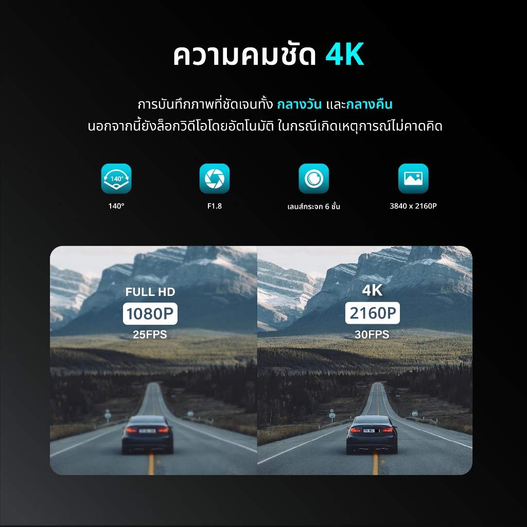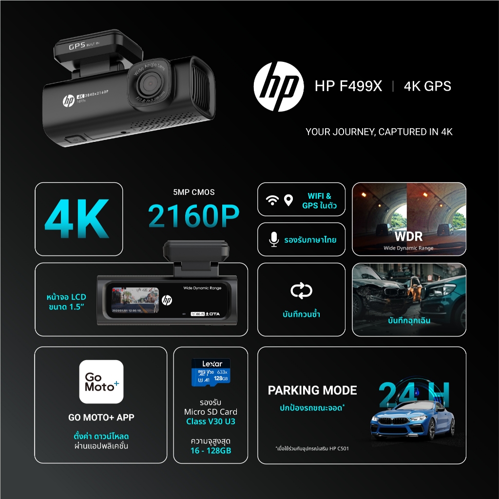 HP F499X Dashcam กล้องหน้าติดรถยนต์ 4K 2160P WDR GPS Wi-Fi กล้องติดรถยนต์ มุมกว้าง 140 องศา บันทึกวนซ้ำ ควบคุมผ่าน APP