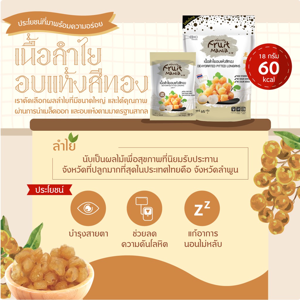 [แพ็คสุดคุ้ม 6 ซอง] FruitMania ฟรุตมาเนีย เนื้อลำไยอบแห้งสีทอง 65 กรัม DEHYDRATED PITTED LONGANS