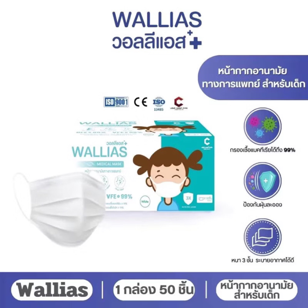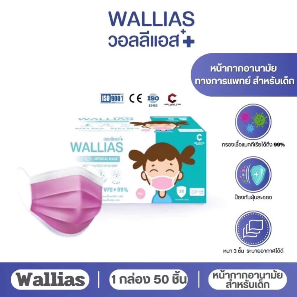 Wallias หน้ากากอนามัยเด็ก Mask KID ยี่ห้อ Wallias BFE>99% หน้ากากอนามัย หนา 3ชั้น ของเด็ก