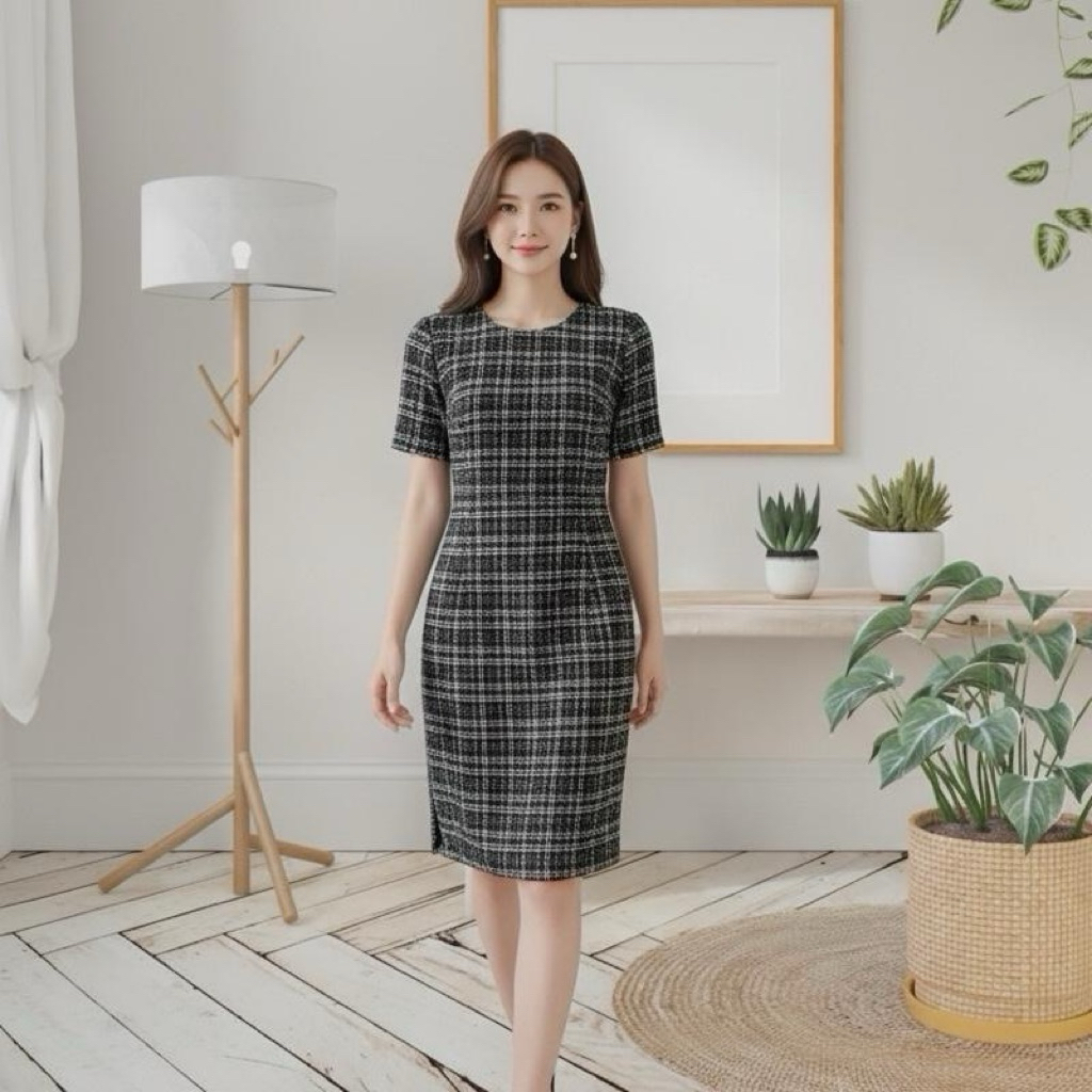 S401 เดรสสั้นผ้าทวิตทรงเอ คอกลมแขนสั้น กปทรงเอเข้ารูป มีซับในทั้งตัว