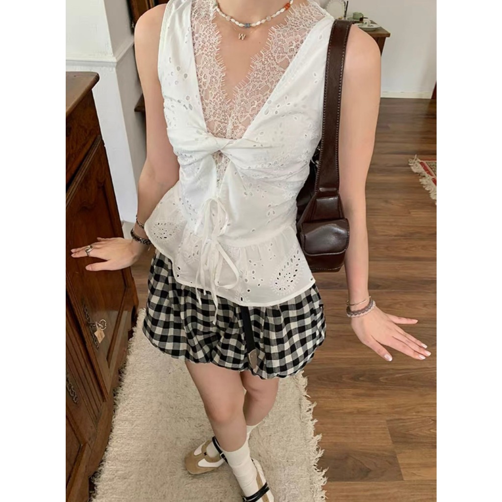 (พร้อมส่ง) เสื้อคอวีแต่งผ้าลูกไม้รุ่น 8467 TAG WG.WE 🇰🇷