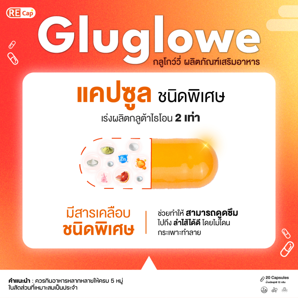 (ร้านหลักบริษัท) | (1 กระปุก) | 40 แคปซูล | Recap+ | Gluglowe Plus | กลูต้า รีแคป ฟอร์ม รีดิวซ์