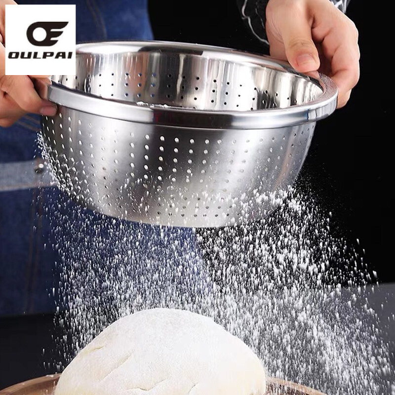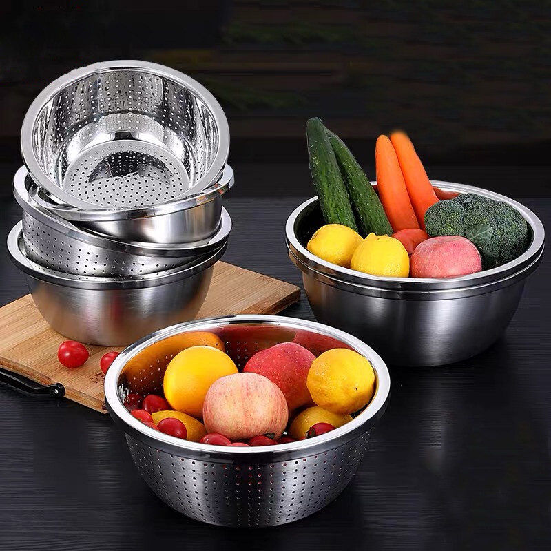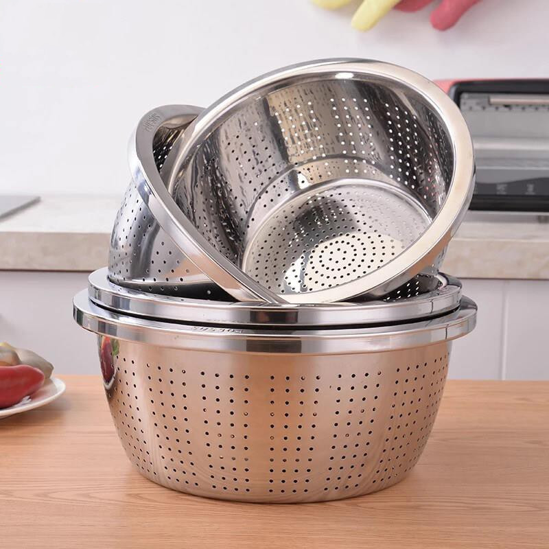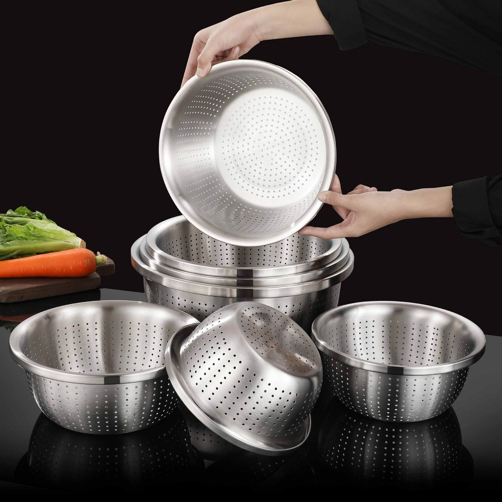 กะละมังสแตนเลสมีรูระบายน้ำ กรองแป้ง 22-40 ซม. ตะแกรงล้างผักเกรด กันสนิม ใช้ได้ทั้งครัวบ้านและร้านอาหาร