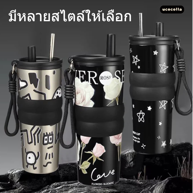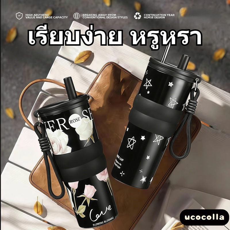UCOCOLLA COD ถ้วยน้ําแข็งสแตนเลสเซรามิก 700MLแก้วกาแฟ เก็บน้ําแข็งไม่ละลาย12ชม พร้อมเครื่องประดับ