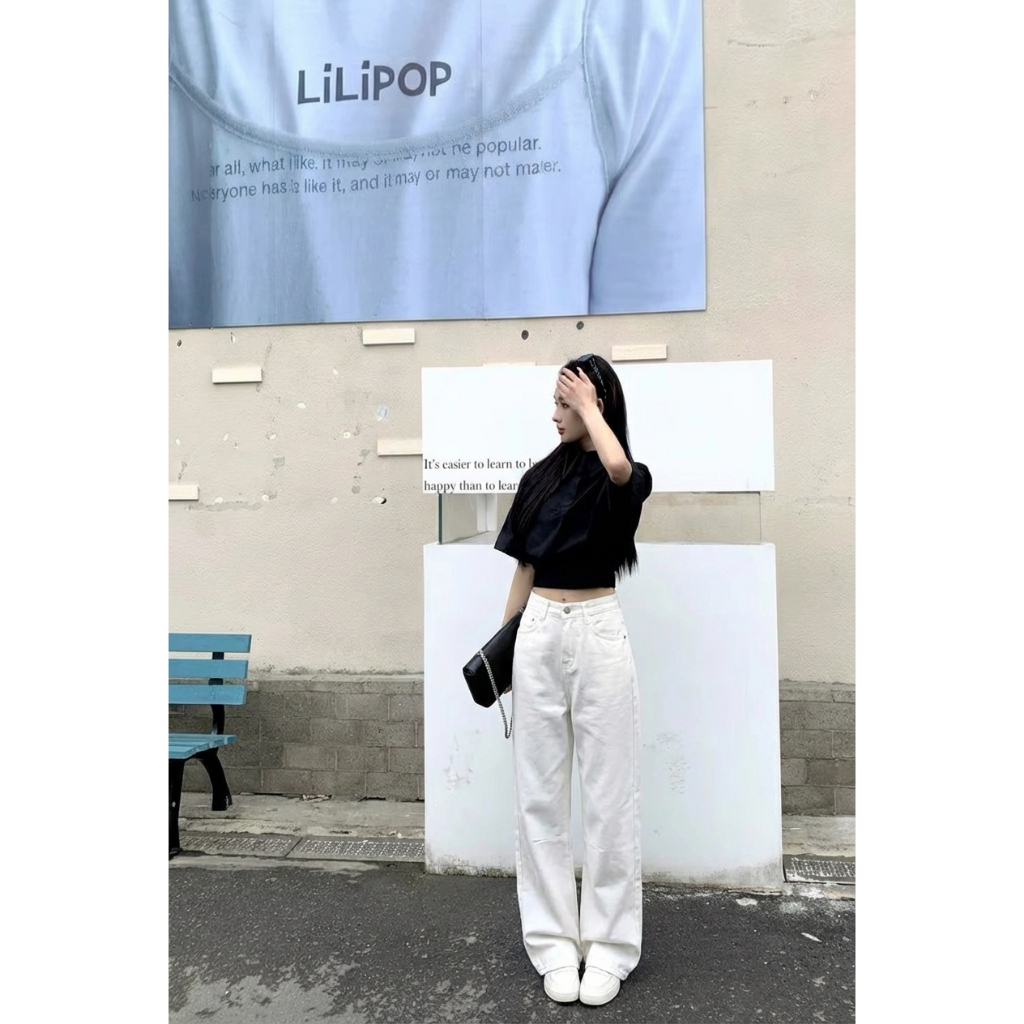 B&R พร้อมส่ง กางเกงยีนส์เอวสูงทรงหลวมสำหรับผู้หญิง กางเกงขาบานทรงโค้ง ย้อนยุคทรงหลวม สีขาวและสีน้ำเงิน