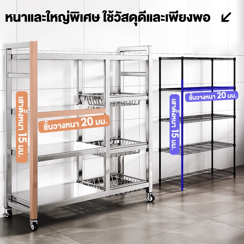 Compact Steel [สแตนเลส] ชั้นวางของในครัว พร้อมหล้อ มาพร้อมตะกร้า ชั้นวางของเหล็ก ปรับระดับความสูงได้ ตะกร้าถอดได้
