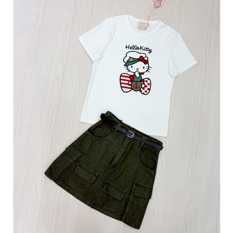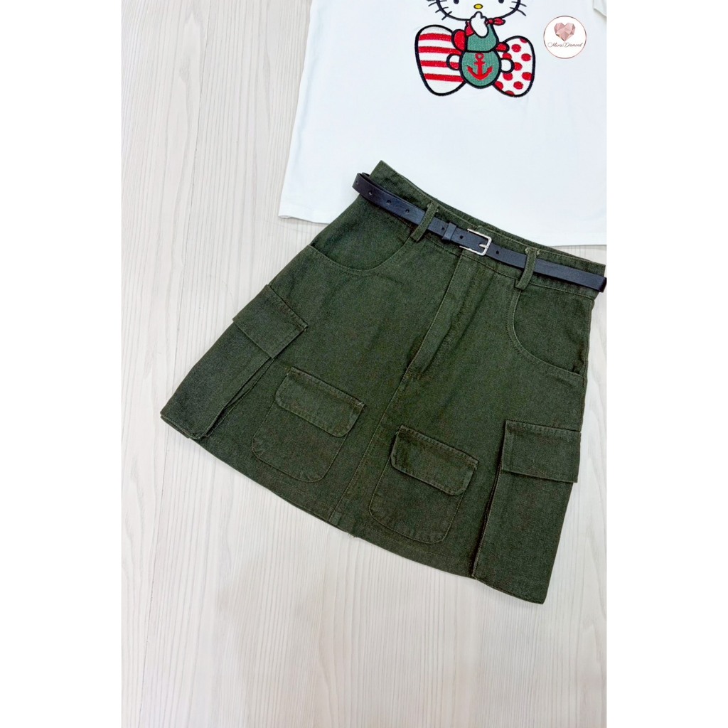 (มี3XL) เซ็ต 3 ชิ้น Commander Kit Set เซ็ต เสื้อยืดงานปัก + กระโปรงยีนส์คาร์โก้สีเขียวทหาร + เข็มขัดสีดำ