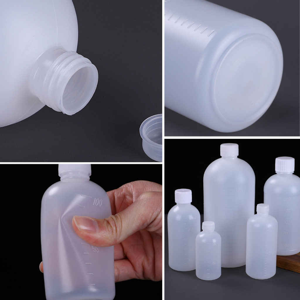 ขวดพลาสติก ขวดยาน้ำ ใส่สารเคมี มีสเกล ขนาด 100/250/500/1000ml ขวดสีขาวขุ่น ใส่เครื่องดื่ม บีบได้ วัสดุPE