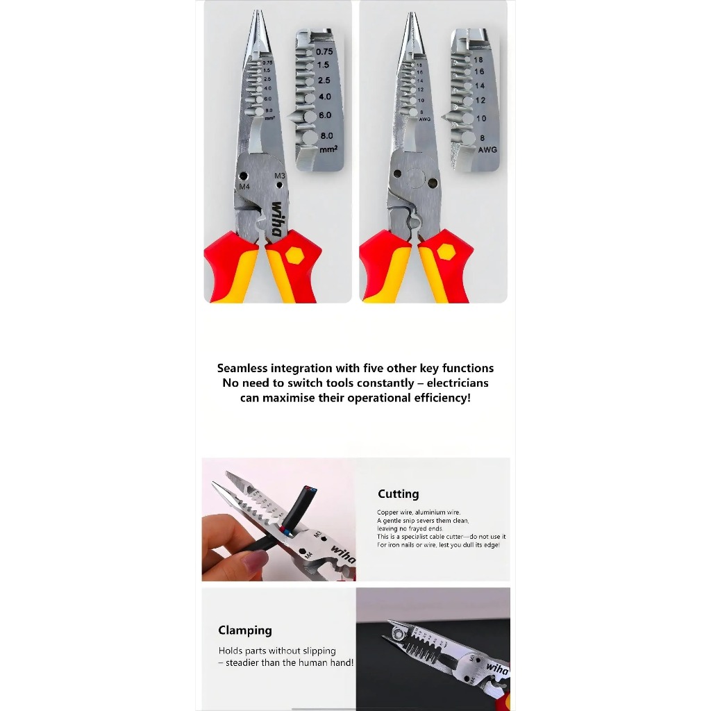 Wiha 47199 Multi-Functional 6-in-1 อุตสาหกรรมเครื่องปอกสายไฟฉนวน 1000V VDE Crimp คีมตัดสําหรับช่างไฟฟ้า
