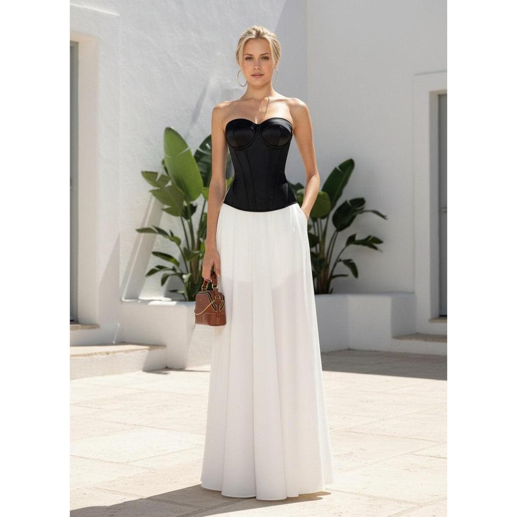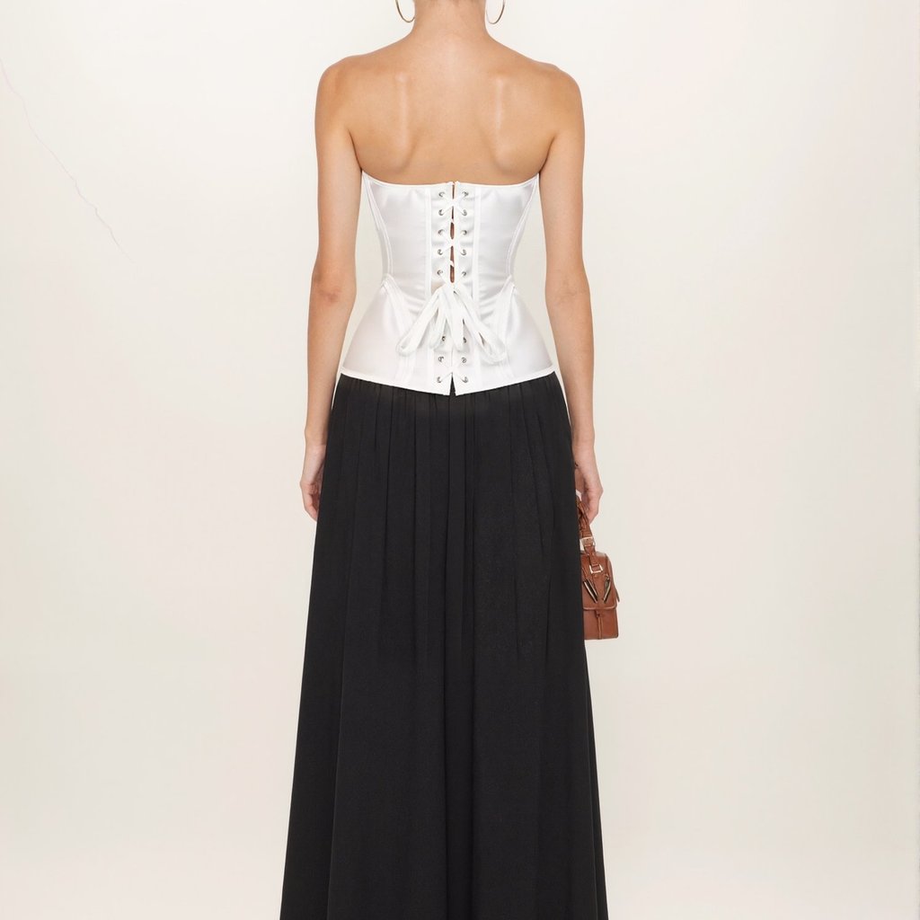 คอร์เซ็ตผ้าซาตินสไตล์ยุโรปและอเมริกา แบบฝรั่งเศส มีโครงเสริมทรง สีดำ ไม่มีสายรัดไหล่ เข้ารูปช่วงเอว เหมาะสำหรับผู้หญิงรูปร่างอวบที่มีหน้าอกใหญ่ คอร์เซ็ท corset top