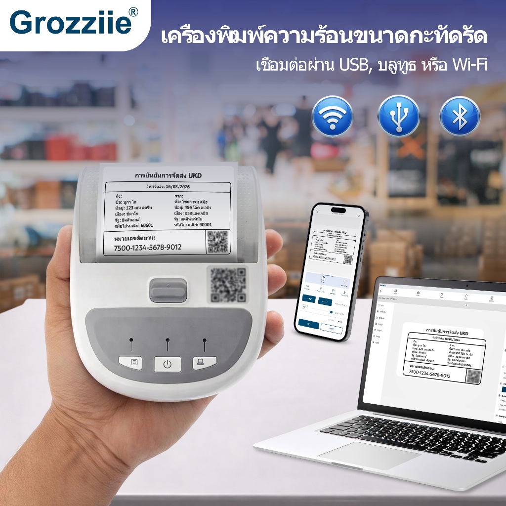 เครื่องพิมพ์ฉลากความร้อนแบบพกพา GROZZIIE | Bluetooth USB | เครื่องพิมพ์บาร์โค้ด สติกเกอร์ และฉลากการจัดส่ง