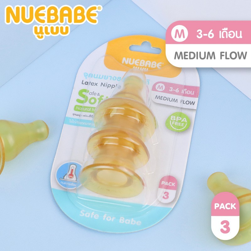 Nuebabe จุกนมยางธรรมชาติ คอแคบ เสมือนนมเเม่ จุกนิ่ม จุกหัวกลม ขนาด S M L แพ็ก 3 ชิ้น