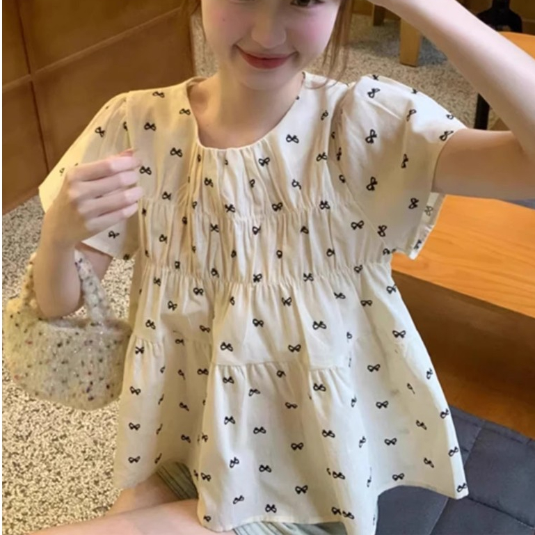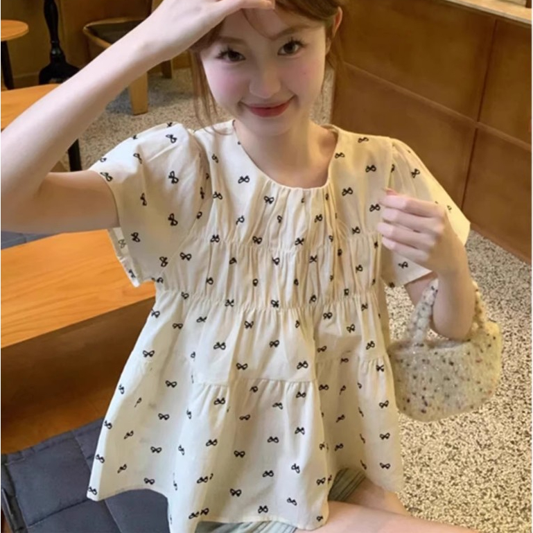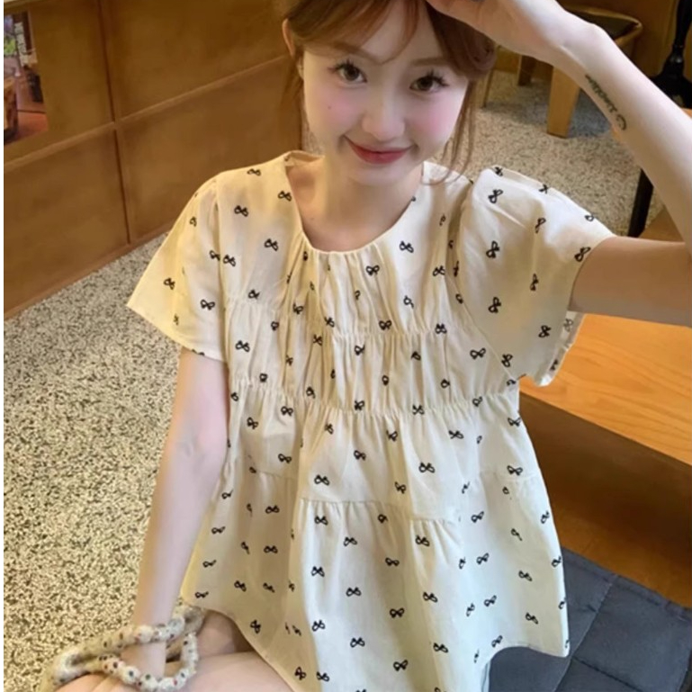 เสื้อผ้าผู้หญิงแขนสั้นลายดอกสไตล์เกาหลี เสื้อครอปผ้าบางเบาเหมาะกับฤดูร้อน ใหม่ล่าสุด