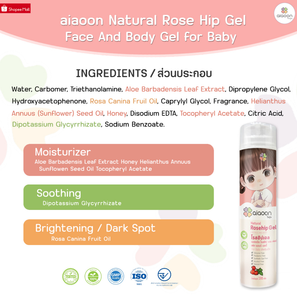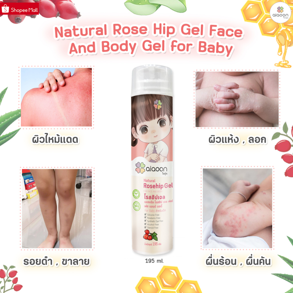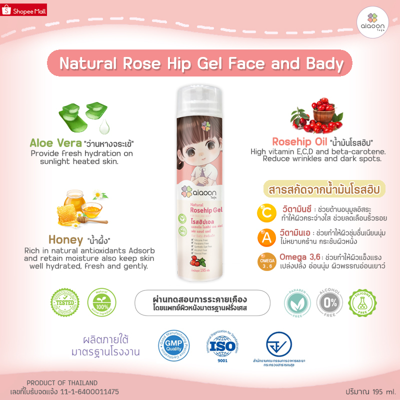 ไออุ่น โรสฮิปเจล บำรุงผิว "ลดรอยดำ"195 g.(aiaoon Natural Rosehip Gel for Face and Body) บำรุงผิวหน้าผิวกายเด็ก