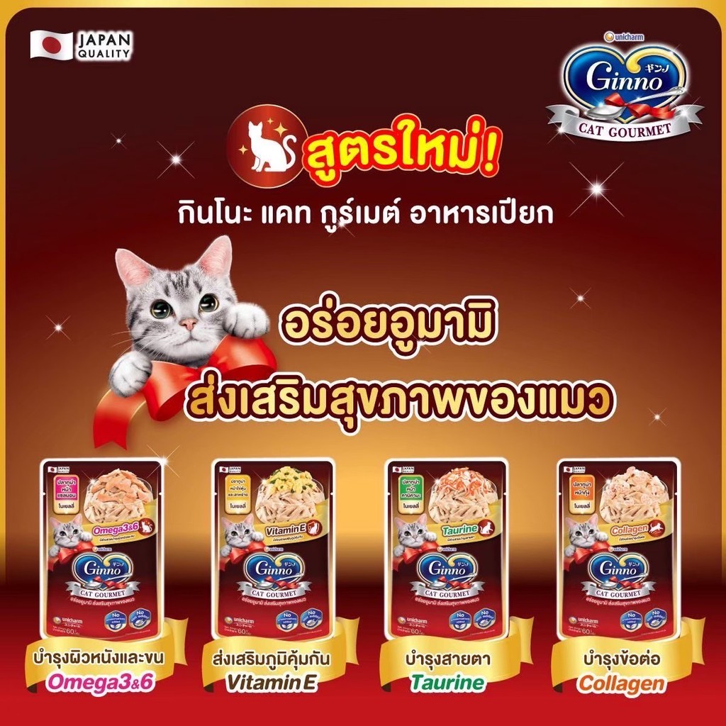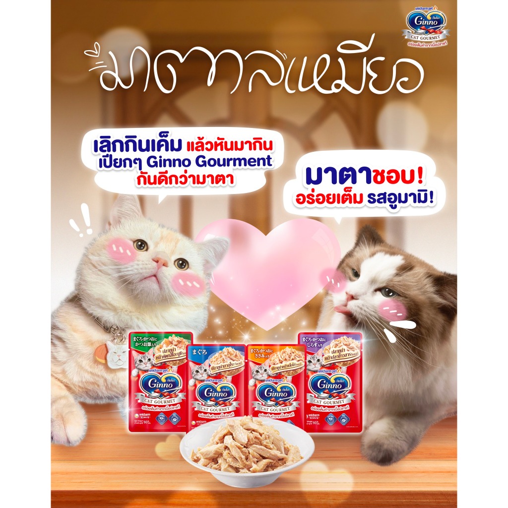 อาหารเปียกแมว Ginno กินโนะ เกรดพรีเมี่ยม ไม่เติมเกลือ ขนาด 60 g มี 14 รสชาติ (1 โหล 12 ซอง)