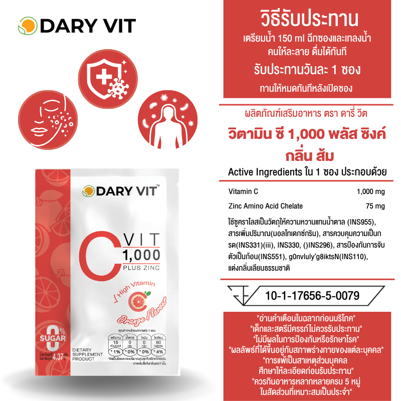Dary Vit Vit C 1,000 Plus Zinc Orange Flavour ดารี่ วิต วิต ซี 1,000 พลัส ซิงค์ กลิ่นส้ม 4.37 กรัม 1 ซอง