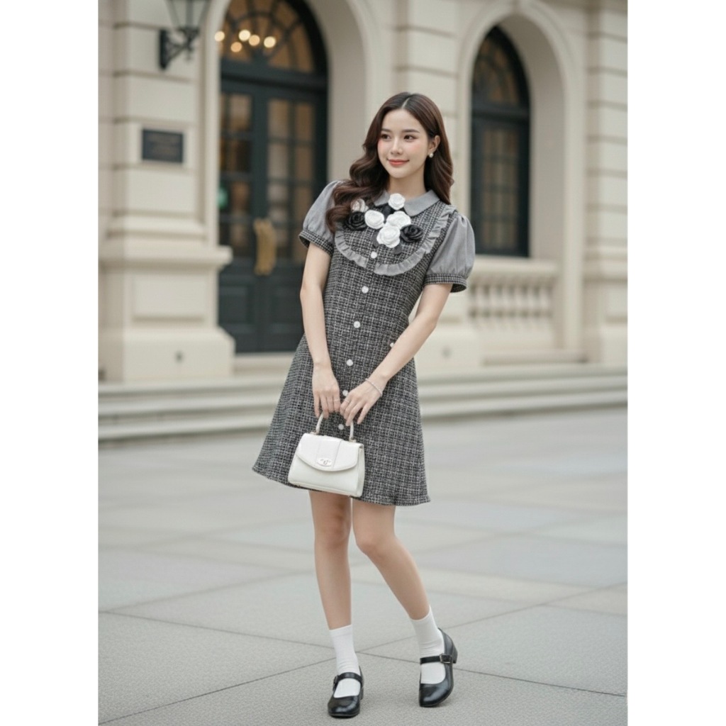 DW102 Blomming Floor ชุดเดรสผ้าทอทวิต พร้อมเข็มกลัดดอกไม้กลางอก 7 ชิ้น