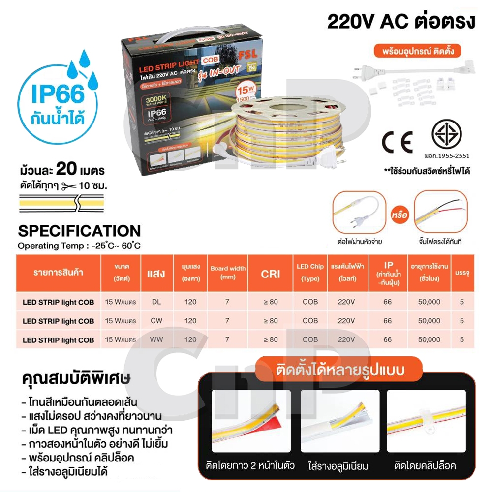 FSL ไฟเส้น ไฟริบบิ้น กันน้ำ LED 220V หรี่แสงได้ (20 เมตร) Strip Light COB รุ่น IN-OUT